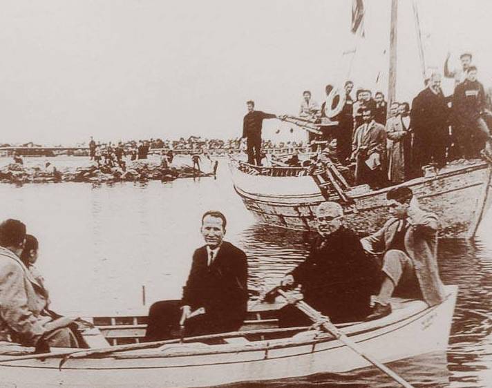 “Θεοφάνια τέλη της δεκαετίας του 1950: Στο λιμανάκι του Αντωνόπουλου. Στη πλώρη ο Κυριάκος Κουμιώτης, που έσπασε δυο φορές το πόδι του για χάρη του ΠΟΣΕΙΔΩΝΑ. Στο κέντρο ο δυναμικός ποδοσφαιριστής και γαλατάς μας, Ηλίας Μπούτος. Στο κουπί ο Κοτσώνης ο ψαράς. Το καϊκι είναι το ιστορικό καταδυτικό ΑΙΑΣ, του καπετάν Κλήμη, που βυθίστηκε στην Αίγυπτο”.