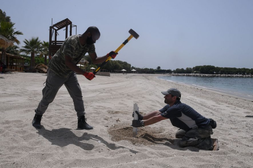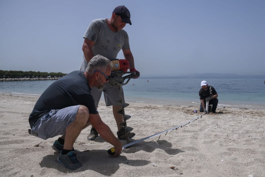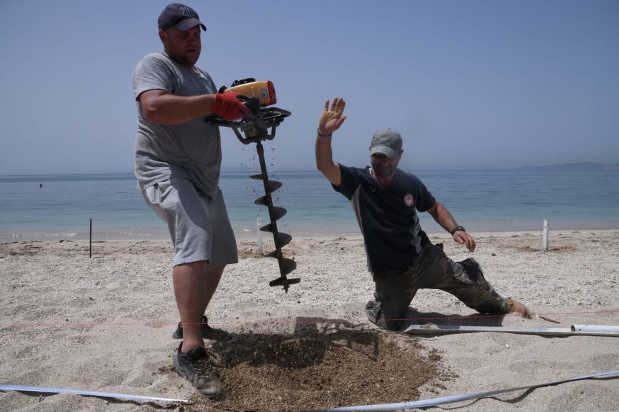 Με μπουλντόζες, τρυπάνια και με το μέτρο στο χέρι, οι υπεύθυνοι των οργανωμένων πλαζ προετοιμάζουν τις τελευταίες ώρες τις παραλίες, ώστε να ανταποκρίνονται στις νέες οδηγίες.
