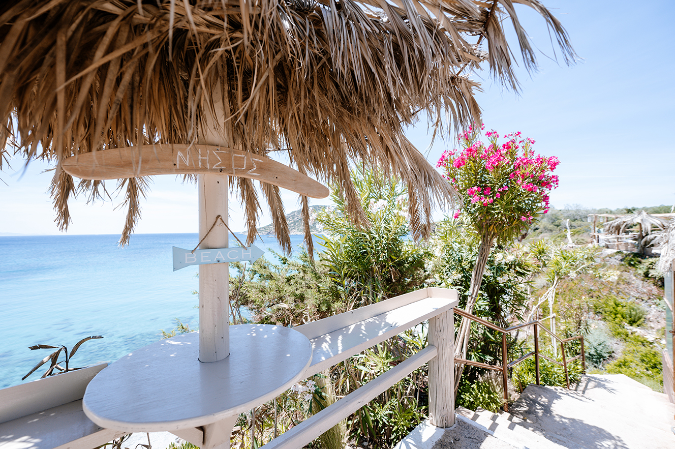 Στην κορυφή του βράχου από πάνω υπάρχει και το Νήσος beach bar, από το οποίο μπορείς να προμηθευτείς όλα τα απαραίτητα για την παραμονή σου στην παραλία. Εναλλακτικά, μπορείς να καθίσεις με την παρέα σου στο μπαρ για να απολαύσεις ποτά και cocktails υπό τους ήχους της μουσικής, που πολλές φορές παίζει δυνατά, αλλά και να χαζέψεις την παραλία και την πανοραμική θέα.