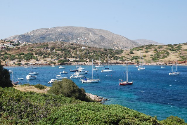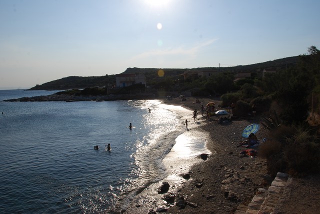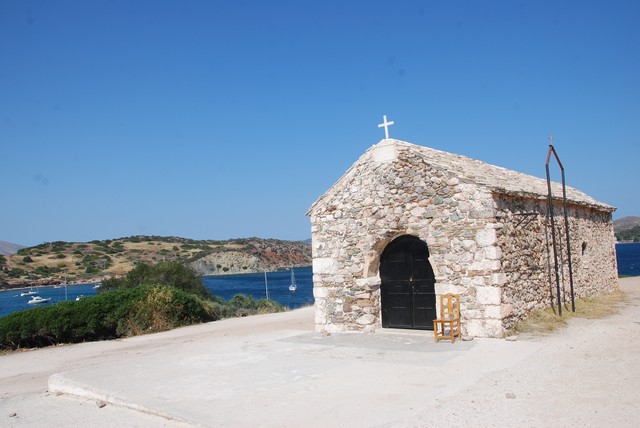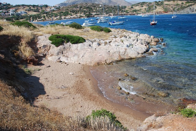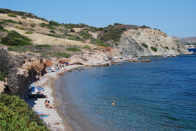 Όπως κάθεσαι στον μικρό λόφο πίσω από την εκκλησία θα δεις στα αριστερά σου πολλά καΐκια, μικρά ιστιοπλοϊκά και βάρκες. Θα χαζέψεις, θα βγάλεις φώτο αλλά η ουσία είναι ότι στο βάθος υπάρχει μια μικρή ακτογραμμή που πρέπει να ανακαλύψεις. Για να φτάσεις είναι απλό. Θα ακολουθήσεις τον χωματόδρομο που θα σε οδηγήσει αρχικά σε μια καντίνα -να κάτσεις να τσιμπήσεις κάτι, είναι όλα τους αγνά- και μετά σε ένα άνοιγμα που από τα αμάξια θα καταλάβεις ότι είναι το πάρκινγκ της παραλίας. Κατέβα τα σκαλάκια και βούτα σε όποιο σημείο μιλήσει η ψυχούλα σου.