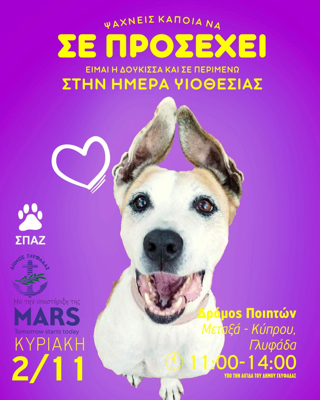 Ο ΣΠΑΖ μας προσκαλεί αυτή την Κυριακή, 2 Νοεμβρίου, στη Γλυφάδα, για μια εκδήλωση υιοθεσίας με στόχο να χαρίσει σε δεκάδες αδέσποτα ζώα ένα μόνιμο και ζεστό σπίτι.