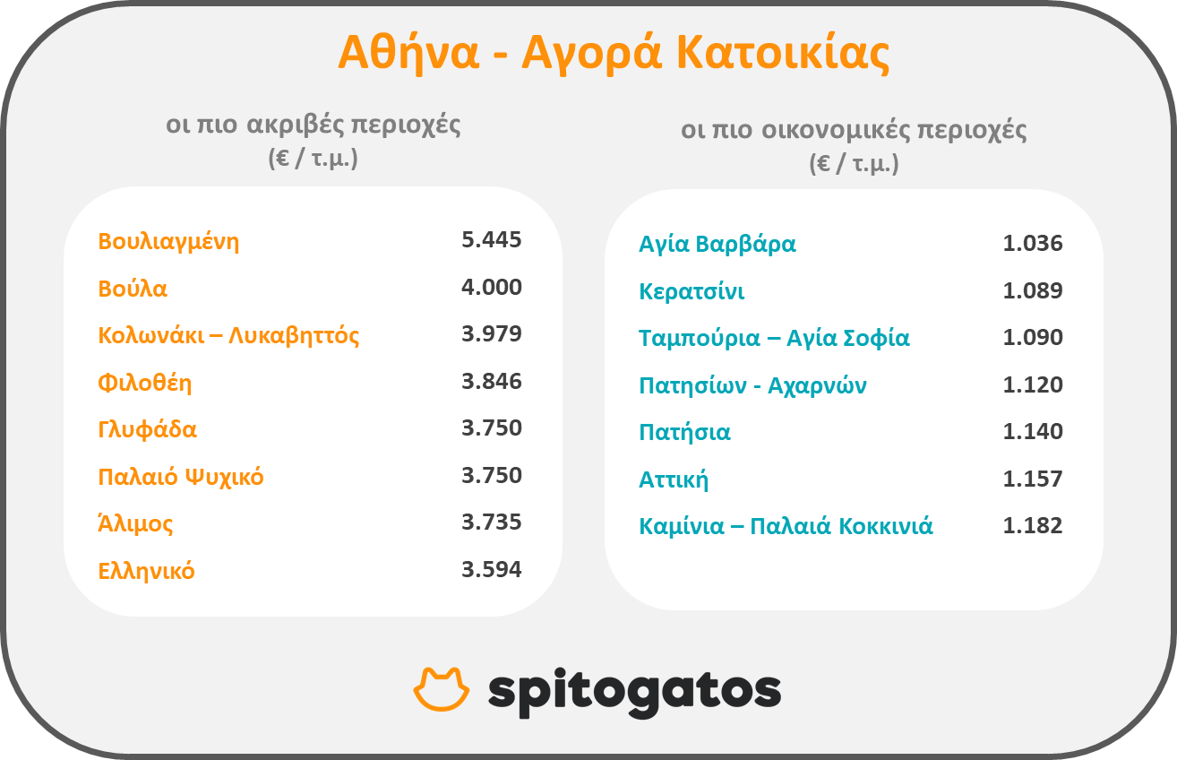 Συγκεκριμένα, οι ακριβότερες περιοχές για αγορά κατοικίας στο λεκανοπέδιο είναι, μεταξύ άλλων, η Βουλιαγμένη και η Βούλα, η περιοχή του Κολωνακίου και του Λυκαβηττού, η Φιλοθέη, η Γλυφάδα, το Παλαιό Ψυχικό, ο Άλιμος και το Ελληνικό. Στον αντίποδα, οι οικονομικότερες περιοχές για αγορά κατοικίας το πρώτο τρίμηνο του 2022 είναι η Αγία Βαρβάρα, το Κερατσίνι και η περιοχή Ταμπούρια – Αγία Σοφία στον Πειραιά.