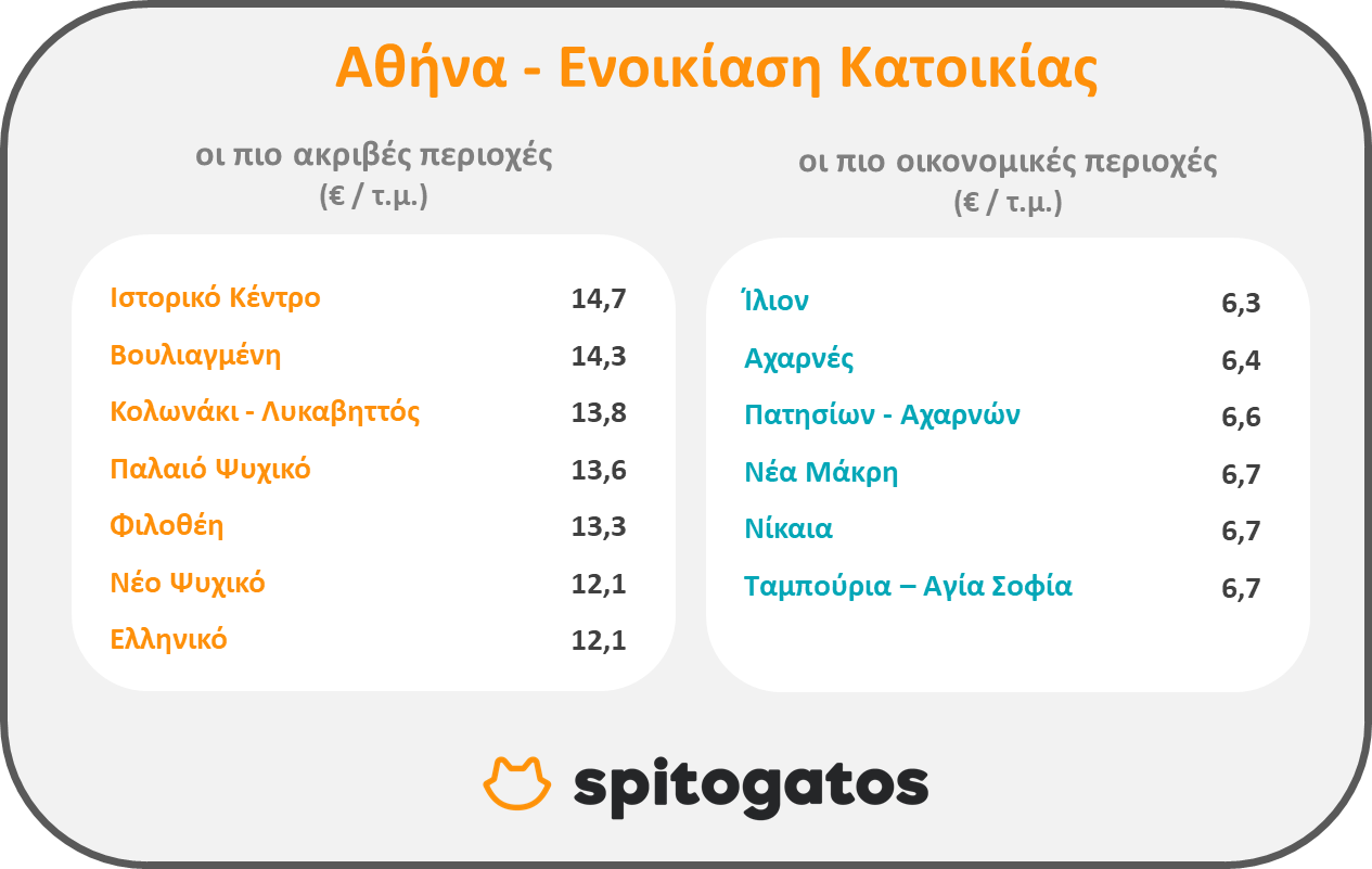 Ως προς την ενοικίαση κατοικίας, το ιστορικό κέντρο, η Βουλιαγμένη, η περιοχή του Κολωνακίου και του Λυκαβηττού, το Παλαιό Ψυχικό, το Νέο Ψυχικό και η Φιλοθέη είναι μεταξύ των ακριβότερων περιοχών της Αττικής, ενώ στη λίστα με τις περιοχές όπου εντοπίζονται τα ακριβότερα ενοίκια συγκαταλέγεται και το Ελληνικό.