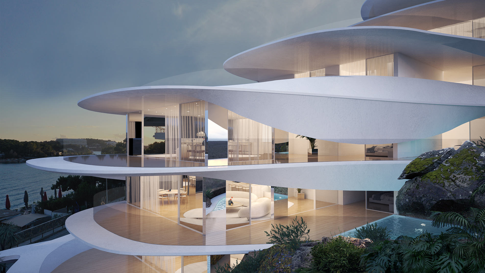 Όλα τα δάπεδα, εσωτερικά και εξωτερικά, θα είναι ξύλινα, με σανίδες που παραπέμπουν με τις διαστάσεις τους σε αυτές του ντεκ ενός σκάφους. Προτείνεται μάλιστα να περαστούν με γυαλιστερό βερνίκι, για να δημιουργηθούν έντονες αντανακλάσεις. Οι εξωτερικοί τοίχοι και τα αρχιτεκτονικά στοιχεία προτείνεται να βαφτούν λευκά, για να ανταποκρίνονται στην κεντρική ιδέα του σκάφους, όπως και στη γενικότερη αισθητική του γραφείου. Πισίνες και τεχνητές λίμνες έχουν προσαρμοστεί στα μπαλκόνια, και καμουφλάρονται χάρη στα αρχιτεκτονικά στοιχεία για ιδιωτικότητα.