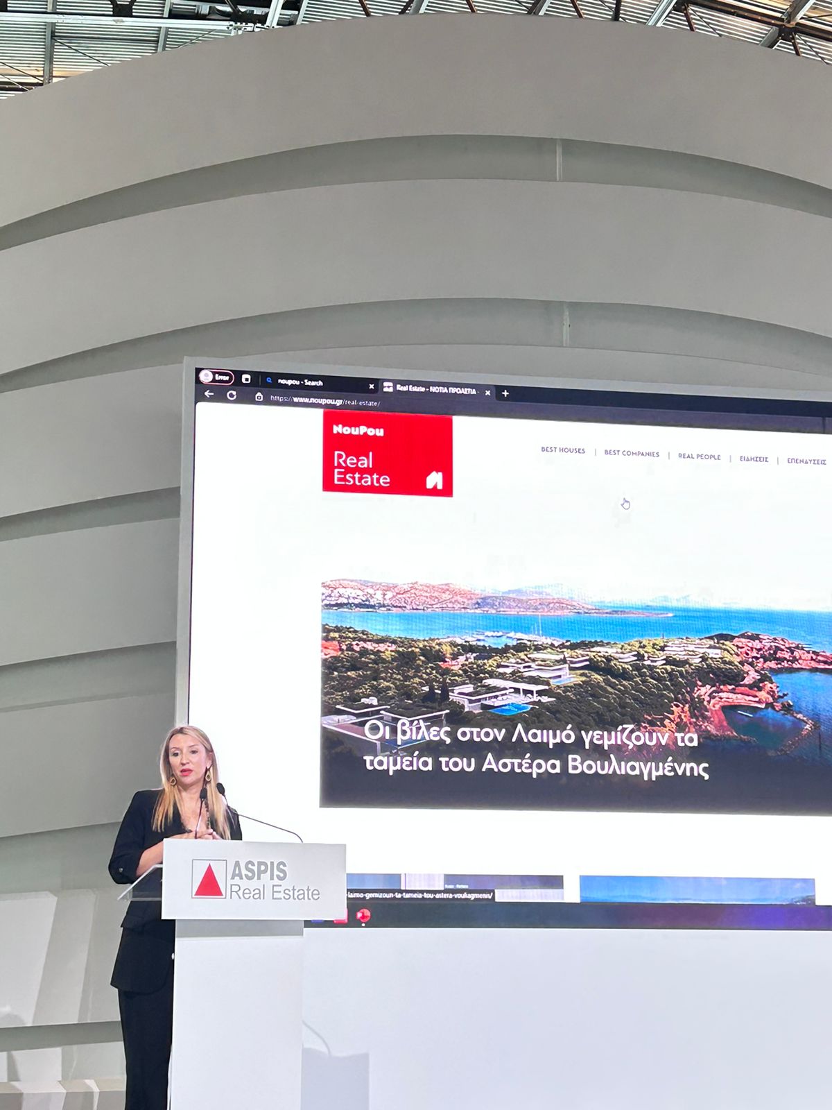 Το «παρών» στην ημερίδα έδωσε και το NouPou, το οποίο εκπροσώπησε η διευθύντρια του εμπορικού τμήματος κ. Μαρία Τουλιάτου, η οποία απηύθυνε χαιρετισμό λέγοντας μεταξύ άλλων: «Ελπίδα των ανθρώπων του NouPou είναι τα νότια προάστια να γίνουν το επίκεντρο μίας συνταρακτικής αλλαγής με θετικό πρόσημο σε κάθε τομέα για κάθε κάτοικο, επισκέπτη, ακόμη και επιχείρηση που δραστηριοποιείται εδώ. Μία αλλαγή που ξεκινά από το ανεπανάληπτο project του Ελληνικού και διαχέεται στις τριγύρω περιοχές και δήμους, ακόμη και την Ελλάδα και τη Μεσόγειο. Η ομάδα του NouPou το φαντάζεται και το παρομοιάζει σαν ένα λευκό βότσαλο που πέφτει σε μία ήρεμη επιφάνεια μίας λίμνης και δημιουργεί ομόκεντρους κύκλους που απλώνονται όλο και πιο μακριά. Κύκλους που μας πηγαίνουν όλους μαζί όλο και πιο πέρα, στην οικονομία, την απασχόληση, τη βιωσιμότητα, το επίπεδο ζωής και φυσικά το real estate, που επηρεάζει έντονα την καθημερινότητα του κάθε κατοίκου, αλλά και επισκέπτη».