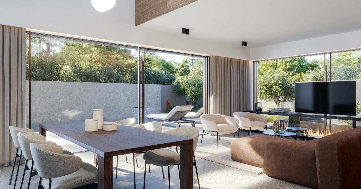 Η σύνδεση του εσωτερικού με το εξωτερικό επιτυγχάνεται μέσω των ιδιαιτέρως μεγάλων παραθύρων, προσδίδοντας έτσι μια μοντέρνα γέφυρα σύνδεσης των ακινήτων με το φυσικό τοπίο.