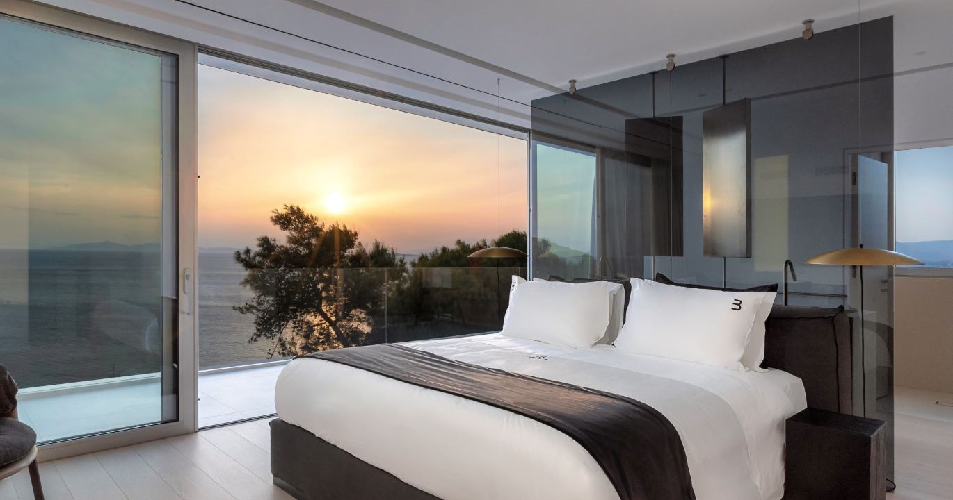 Στο τρίτο επίπεδο βρίσκεται το κυρίως υπνοδωμάτιο με μαγική θέα στη θάλασσα, ποιοτικά λευκά είδη και μοντέρνους εσωτερικούς χώρους, τζάκι και δύο ντουλάπες. Επιπλέον, τρία ακόμη υπνοδωμάτια – το καθένα με δικό του ιδιωτικό μπάνιο – είναι έτοιμα να καλωσορίσουν τους επισκέπτες.
