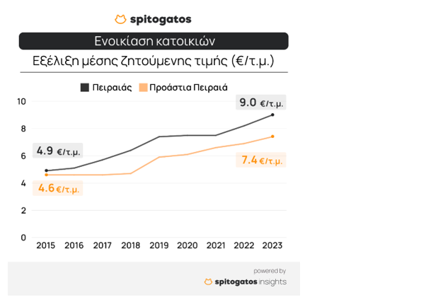 Η μέση ζητούμενη τιμή ενοικίασης κατοικιών στον Πειραιά αυξήθηκε κατά 10% το 2023 σε σύγκριση με το προηγούμενο έτος, ενώ στα Προάστια του Πειραιά η μέση ζητούμενη τιμή ενοικίασης κατοικίας αυξήθηκε κατά 7,6%.