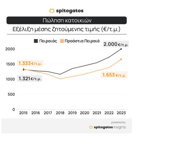 Στις πωλήσεις κατοικιών η εξέλιξη των τιμών από το 2015 μέχρι το 2023 είναι ελαφρώς διαφορετική, με τη μέση ζητούμενη τιμή πώλησης κατοικιών στον Πειραιά και τα Προάστιά του να σημειώνει μείωση μέχρι το 2018. Μετά το 2018, η πορεία των μέσων ζητούμενων τιμών τόσο στον Πειραιά όσο και στα Προάστιά του είναι αυξητική, με τις μέσες ζητούμενες τιμές σήμερα να διαμορφώνονται στα 2.000€/τ.μ. και 1.653€/τ.μ. αντίστοιχα.