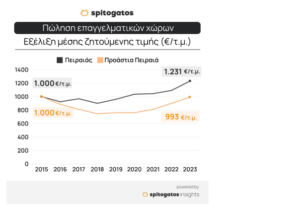 Αύξηση της μέσης ζητούμενης τιμής ενοικίασης και πώλησης επαγγελματικών ακινήτων σημειώθηκε το 2023 στον Πειραιά και τα Προάστιά του. Πιο συγκεκριμένα, αύξηση κατά 12,8% καταγράφηκε στη μέση ζητούμενη τιμή πώλησης επαγγελματικών ακινήτων στον Πειραιά (1.231€/τ.μ.), ενώ κατά 10,3% αυξήθηκε η αντίστοιχη τιμή στα Προάστια του Πειραιά (993€/τ.μ.).