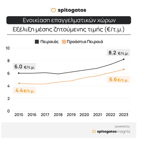 Όσον αφορά την ενοικίαση, το 2023 η μέση ζητούμενη τιμή διαμορφώθηκε στα 8,2 ευρώ/τ.μ., αυξημένη κατά 11,3% σε σχέση με το 2022, ενώ στα Προάστια του Πειραιά η μέση ζητούμενη τιμή ενοικίασης επαγγελματικών ακινήτων φτάνει τα 6,6 ευρώ/τ.μ., αυξημένη κατά 7,8% σε σχέση με το προηγούμενο έτος.