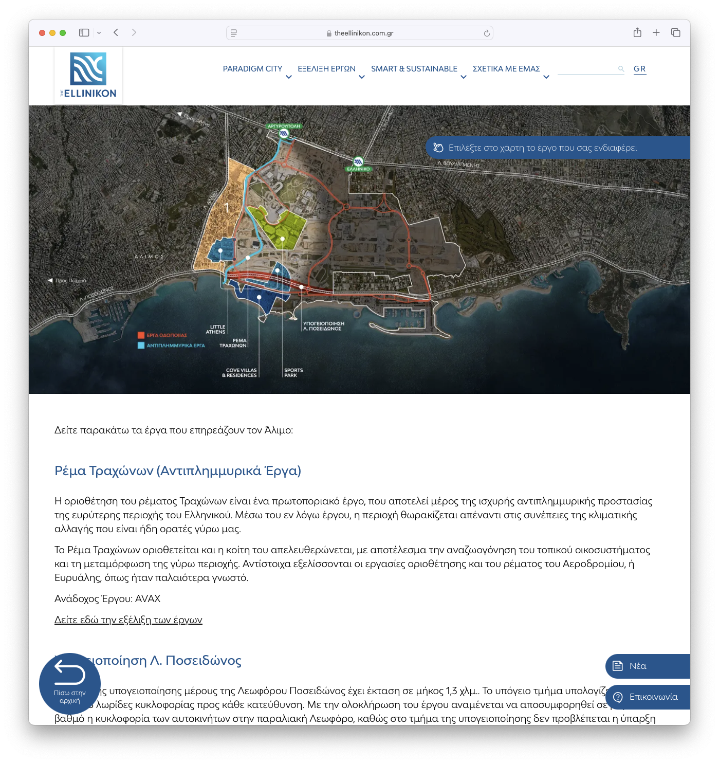 Μπαίνοντας στο site θα δεις έναν χάρτη που απεικονίζει την κάτοψη του The Ellinikon, με τα έργα που βρίσκονται σε εξέλιξη και τις γειτονιές που το πλαισιώνουν, από τη Λεωφόρο Αλίμου μέχρι το Γκολφ Γλυφάδας, και από την Παραλιακή μέχρι τη Λεωφόρο Ιασωνίδου. Δηλαδή όλες τις περιοχές που συνορεύουν με το κατασκευαστικό έργο, ή επηρεάζονται προς το παρόν από τις εργασίες.