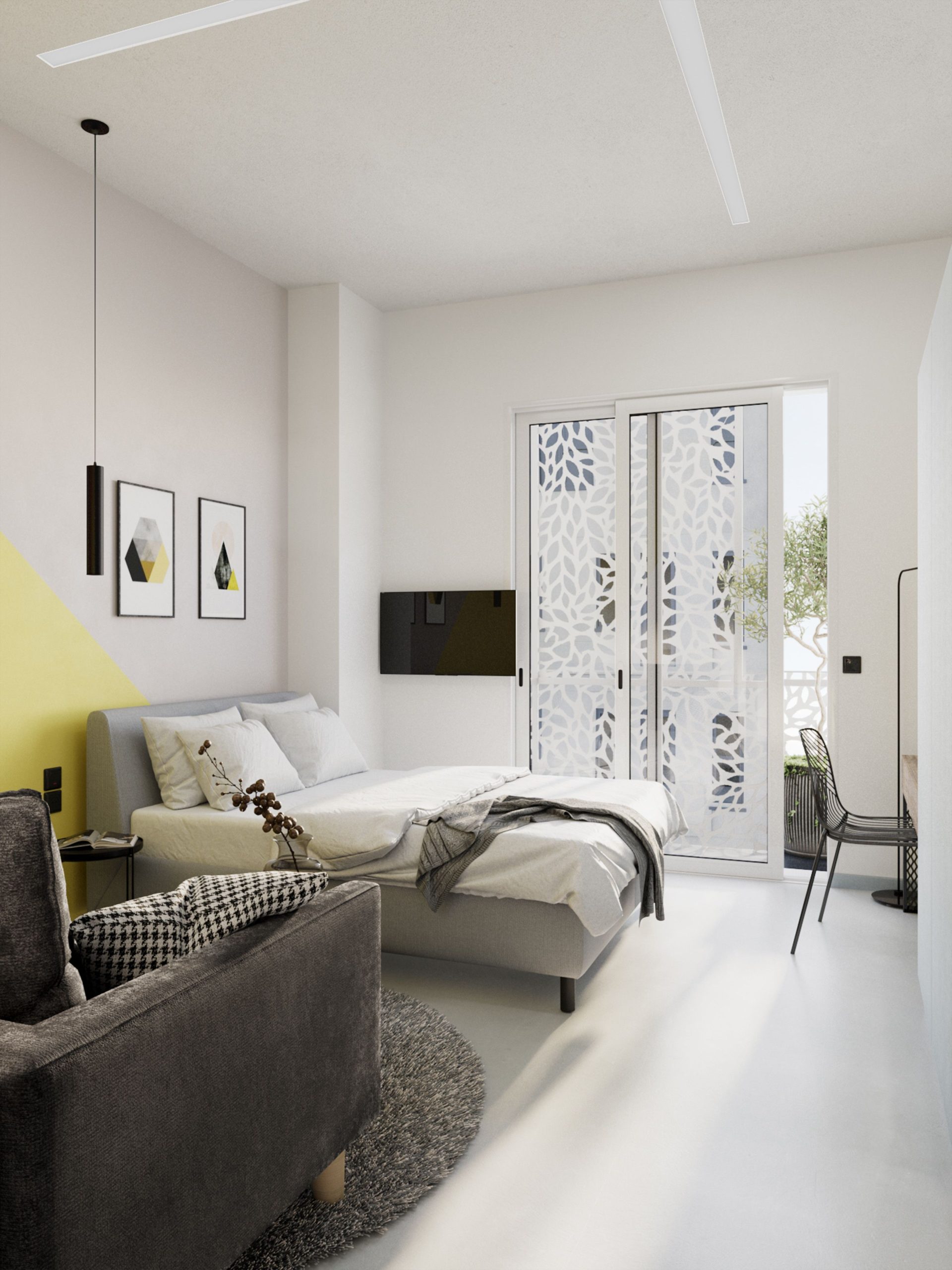 Πρόκειται για εξαώροφο κτίριο που θα διαθέτει 37 επιπλωμένα και εξοπλισμένα στούντιο – διαμερίσματα, ένα κοινό πλυντήριο και ένα γυμναστήριο. Ακολουθώντας το μοντέλο των διαμερισμάτων τέτοιου τύπου, που εξυπηρετούν δηλαδή τις ανάγκες ενός εργαζόμενου, τα διαμερίσματα ξεκινούν από τα 20 τ.μ. και φτάνουν μέχρι τα 29 τ.μ..