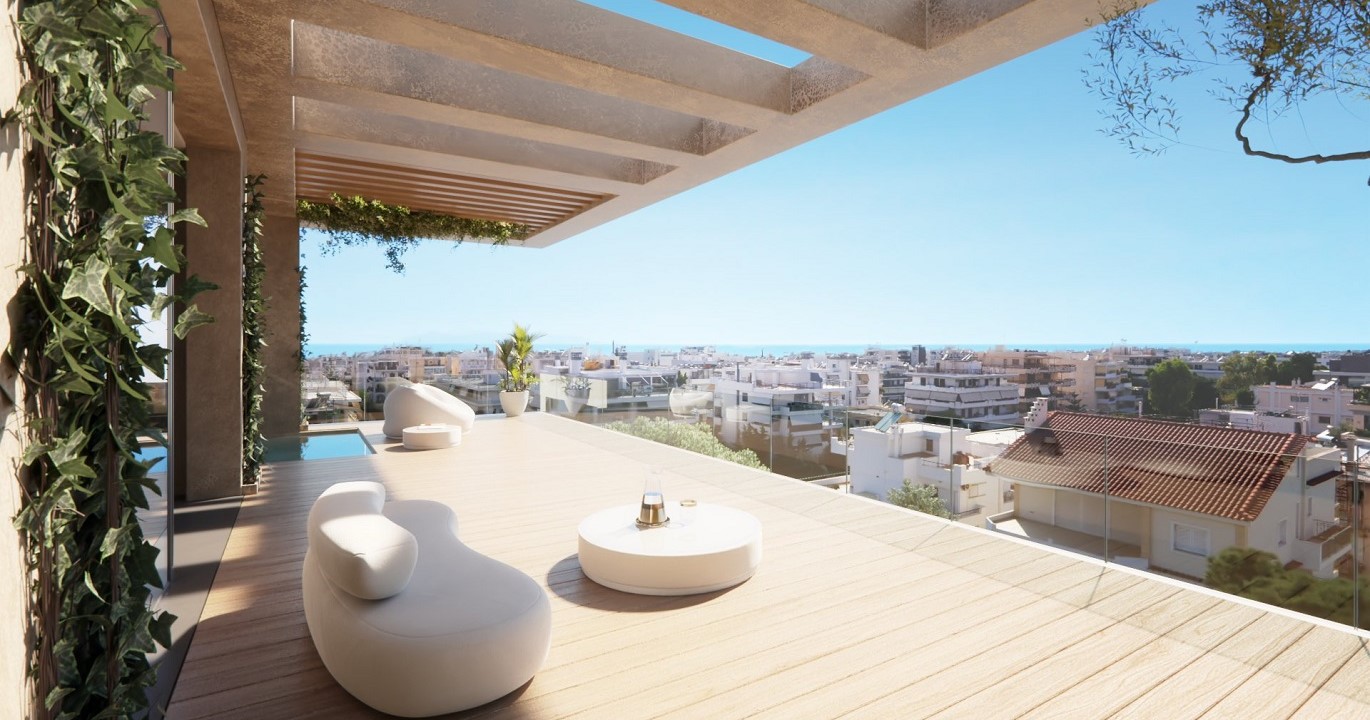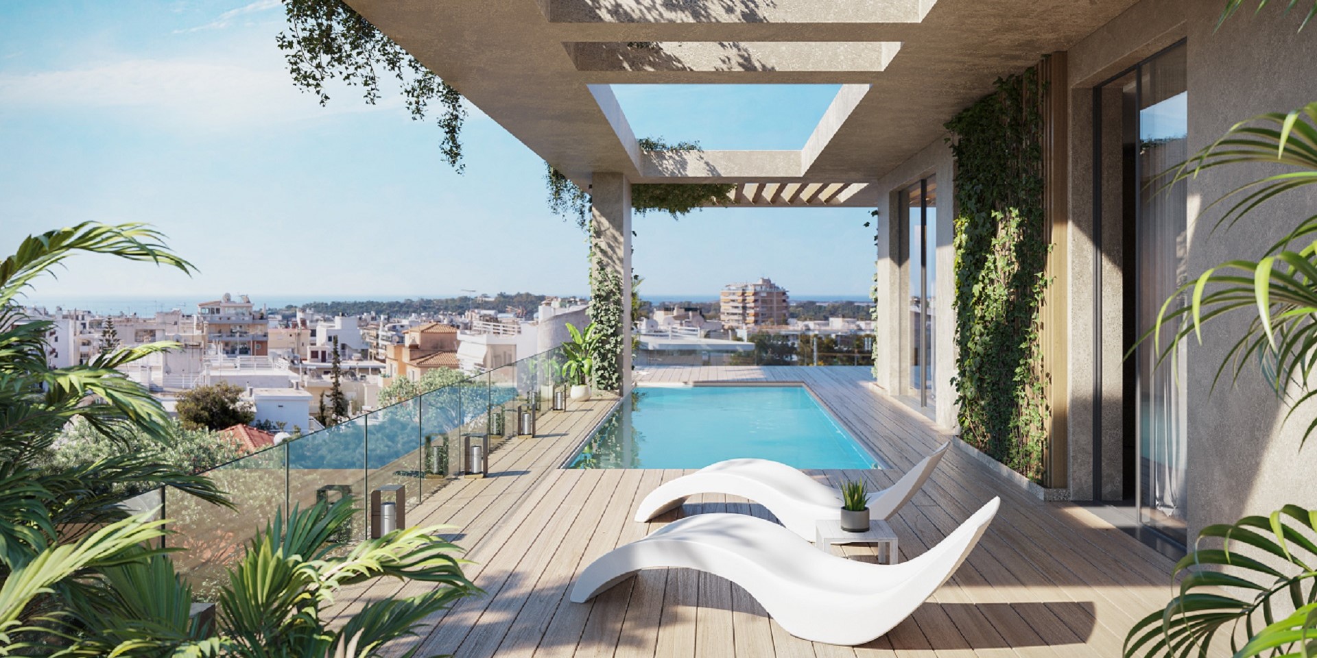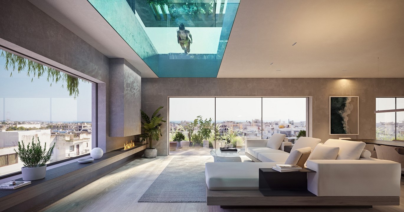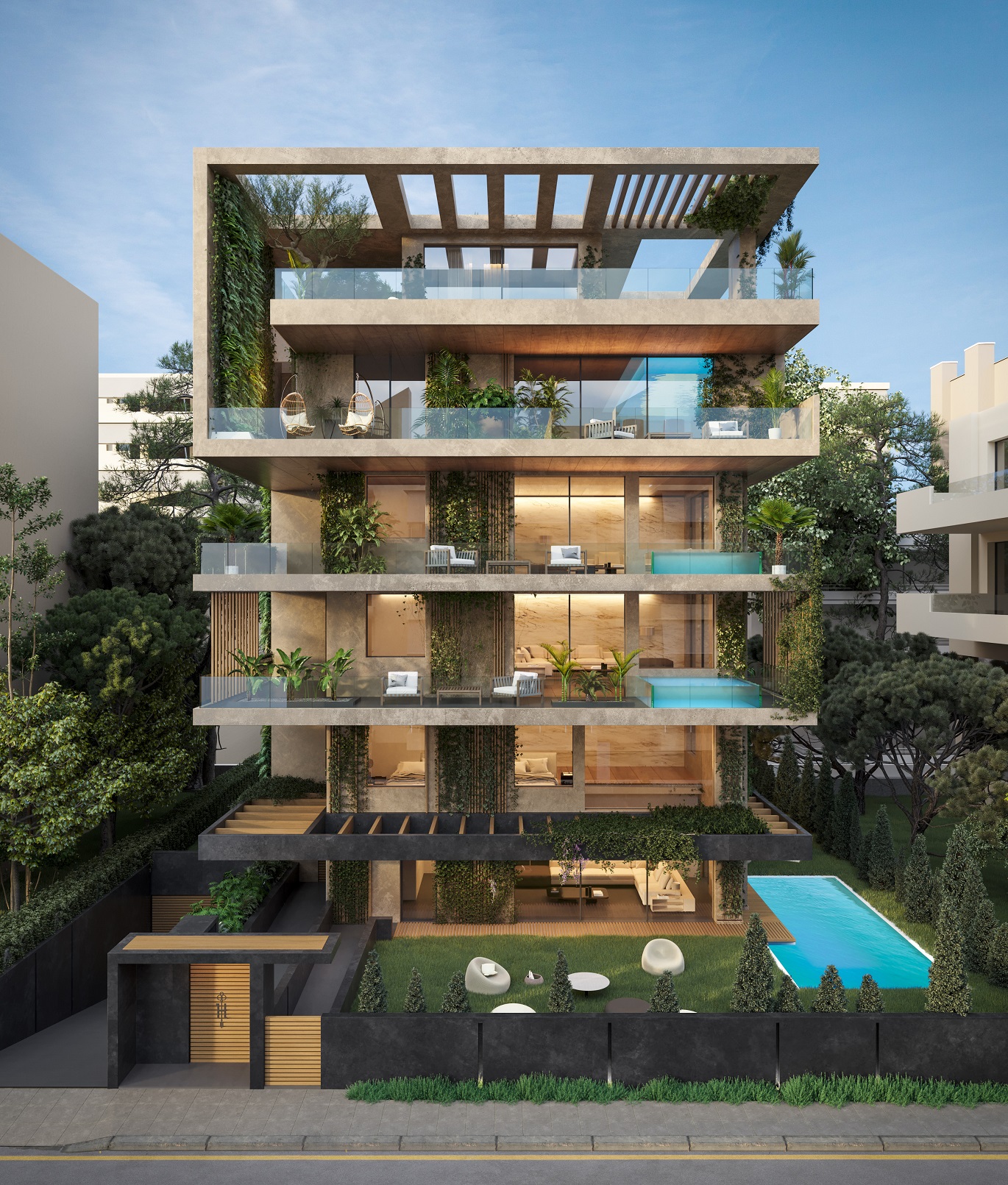 Σε κάθε όροφο, οι ιδιωτικές πισίνες είναι σχεδιασμένες έτσι ώστε να ευθυγραμμίζονται με το ηλιοβασίλεμα και το μπλε της θάλασσας, ενώ η πισίνα του Penthouse rooftop καθρεπτίζεται μέσα στο σαλόνι και την τραπεζαρία, δημιουργώντας ένα μοναδικό συναίσθημα. Το ισόγειο αποτελείται από δύο μεζονέτες τεσσάρων υπνοδωματίων. Η κάθε μια αναπτύσσεται σε τρία επίπεδα, με το δικό τους αποκλειστικό κήπο, μεγάλες πισίνες και playroom. Ο πρώτος και δεύτερος όροφος είναι διαμορφωμένοι ως οροφοδιαμερίσματα τριών υπνοδωματίων, με εργονομικό σχεδιασμό, διαθέτουν open-space καθιστικό, τραπεζαρία και κουζίνα που ανοίγουν πλήρως στις μεγάλες βεράντες. Το κτίριο ολοκληρώνεται με ένα μοναδικού σχεδιασμού Ρετιρέ (Penthouse) που εκτείνεται σε 2 επίπεδα και αποτελεί την επιτομή της πολυτέλειας. Το glass-floor της πισίνας καθρεπτίζεται στο καθιστικό και το μοναδικό roof-garden προσφέρει ανεμπόδιστη θέα στη θάλασσα και το ηλιοβασίλεμα.