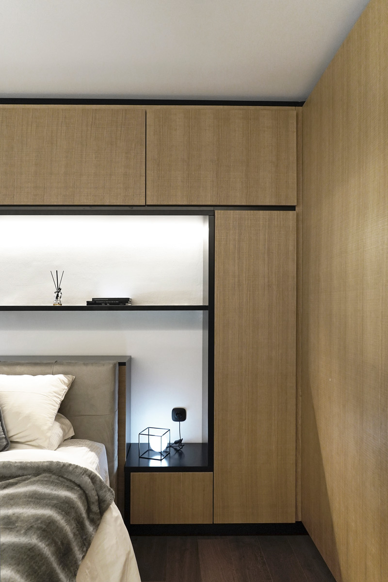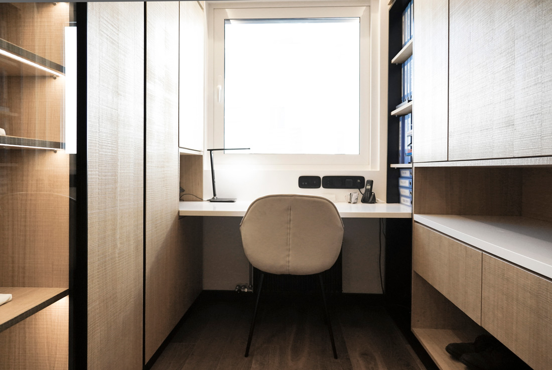 Το έργο αφορά στην ανακαίνιση ενός διαμερίσματος 80τμ. που βρίσκεται στον τρίτο όροφο πολυκατοικίας του 1980. Η προϋπάρχουσα διαρρύθμιση τροποποιήθηκε ριζικά, ούτως ώστε να εξασφαλιστούν η καθαρότητα της κίνησης και η λειτουργικότητα των χώρων. Ο σχεδιασμός κινήθηκε σε minimal γραμμές με ενιαίες λευκές επιφάνειες που λειτουργούν ως ουδέτερος καμβάς για την ανάδειξη των ξύλινων επενδύσεων που προσδίδουν ζεστασιά στο χώρο. Ταυτόχρονα, ο ατμοσφαιρικός φωτισμός τονίζει τις βασικές χαράξεις και υπογραμμίζει την ποιότητα των υλικών. Δρύινες επενδύσεις διατρέχουν μεγάλο μέρος των επιφανειών και συντελούν στην αντίληψη του χώρου ως ενός ενιαίου συνόλου, συνθέτοντας ένα κοινό λεξιλόγιο.
