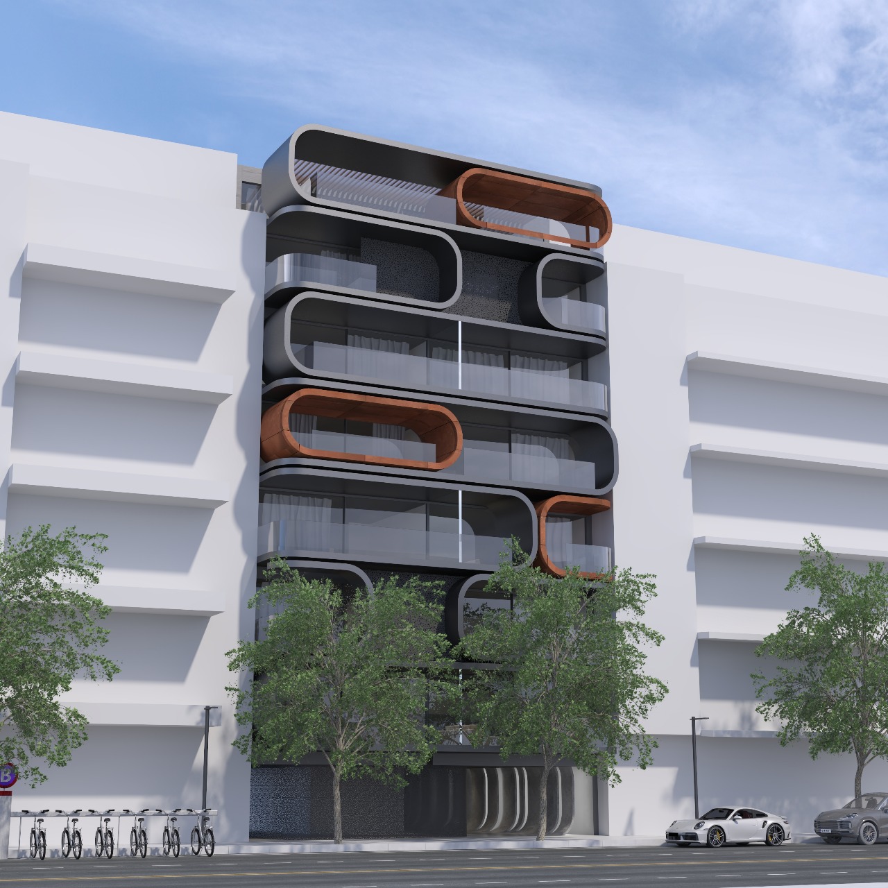 Μετά από αλλαγές στο θεσμικό πλαίσιο που επηρέασαν τον αρχικό σχεδιασμό, η ανάπτυξη αναθεωρήθηκε και υλοποιείται σε μικρότερη κλίμακα από την αρχικά προβλεπόμενη. Τα διαμερίσματα ανά όροφο είναι δύο, επιφανείας περίπου 92 και 107 τ.μ., ενώ το ρετιρέ φτάνει τα 180 τ.μ. και συνοδεύεται από μεγάλο εξώστη με δυνατότητα πισίνας ή jacuzzi.