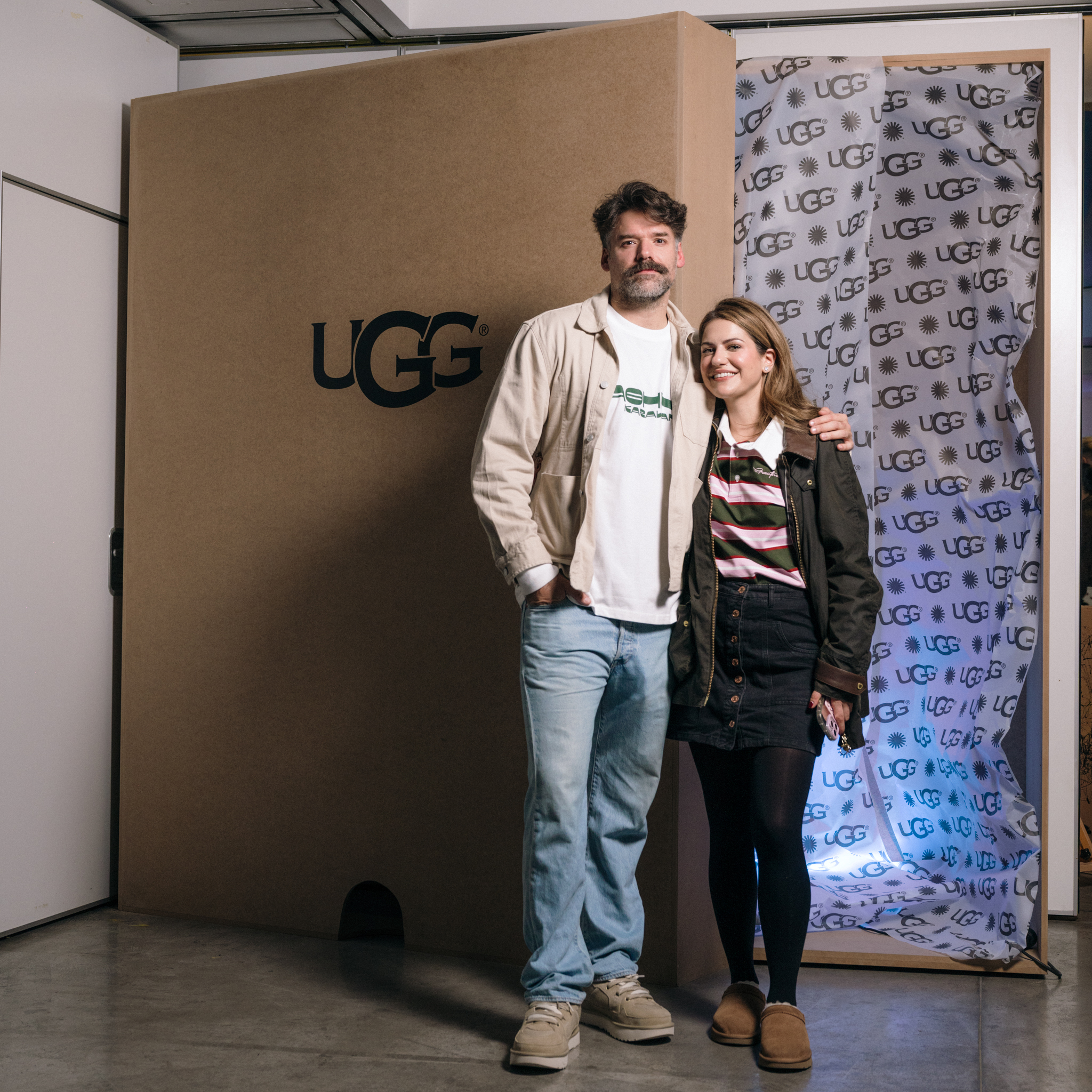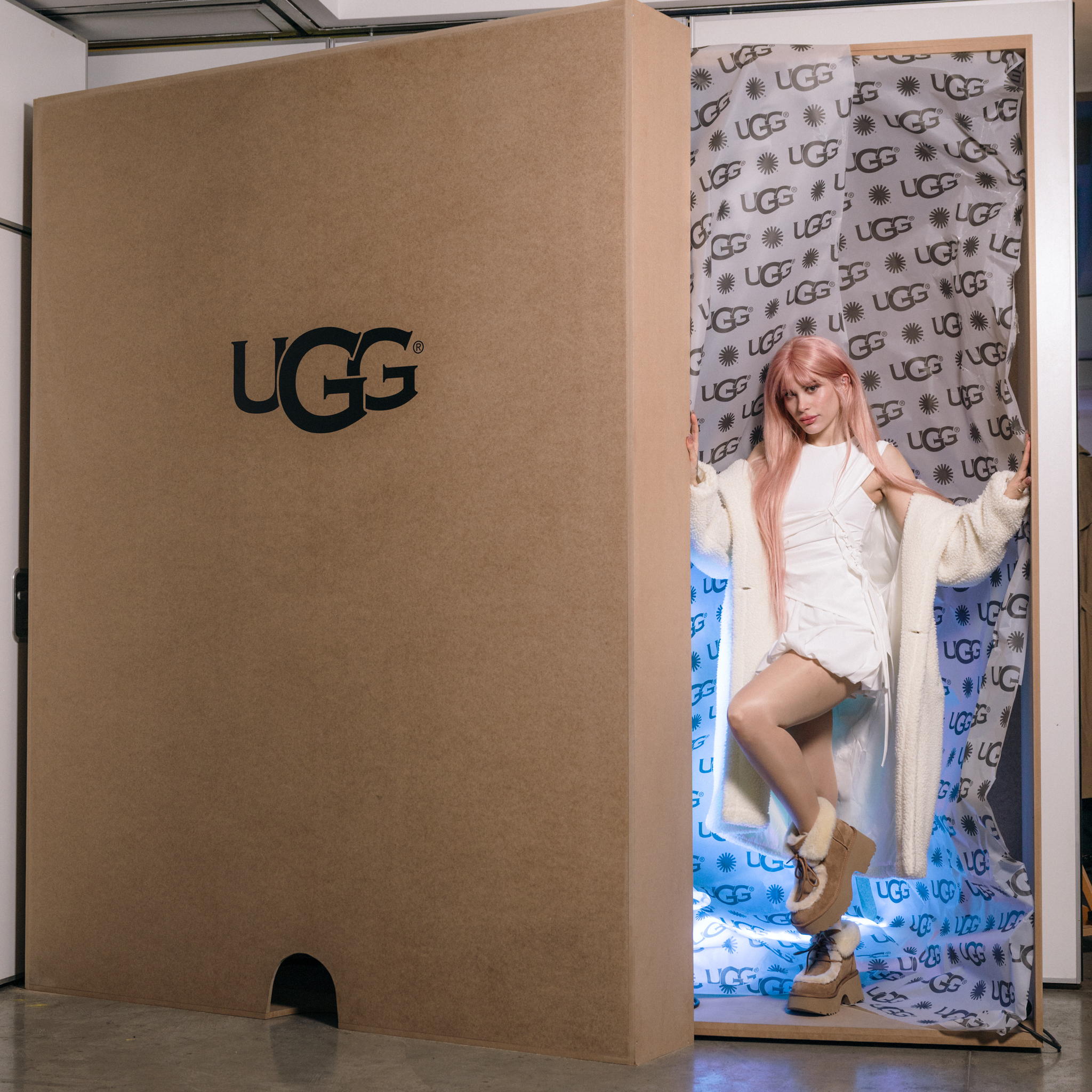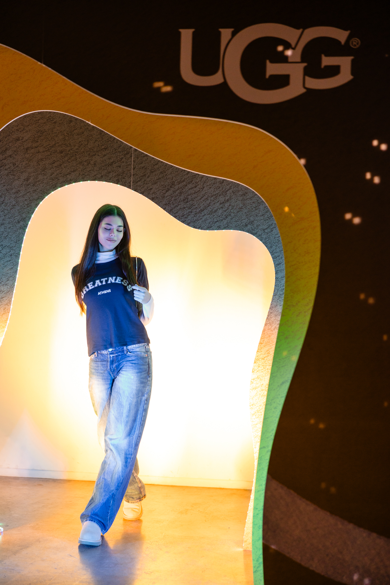 Ο χώρος είχε μεταμορφωθεί πλήρως σε ένα cozy UGG περιβάλλον. Τους καλεσμένους υποδεχόταν στον χώρο ένα εντυπωσιακό γιγάντιο UGG Shoe Box, στο οποίο μπορούσαν να φωτογραφηθούν, ενώ ένα φωτεινό installation σε γαλάζιες και κίτρινες αποχρώσεις – τα βασικά χρώματα της καμπάνιας – δημιουργούσε το ιδανικό σημείο για content. Το DJ booth και η γωνιά του customization ήταν επενδυμένα με γούνα, στοιχείο που παραπέμπει άμεσα στην iconic υφή και τα υλικά της UGG.