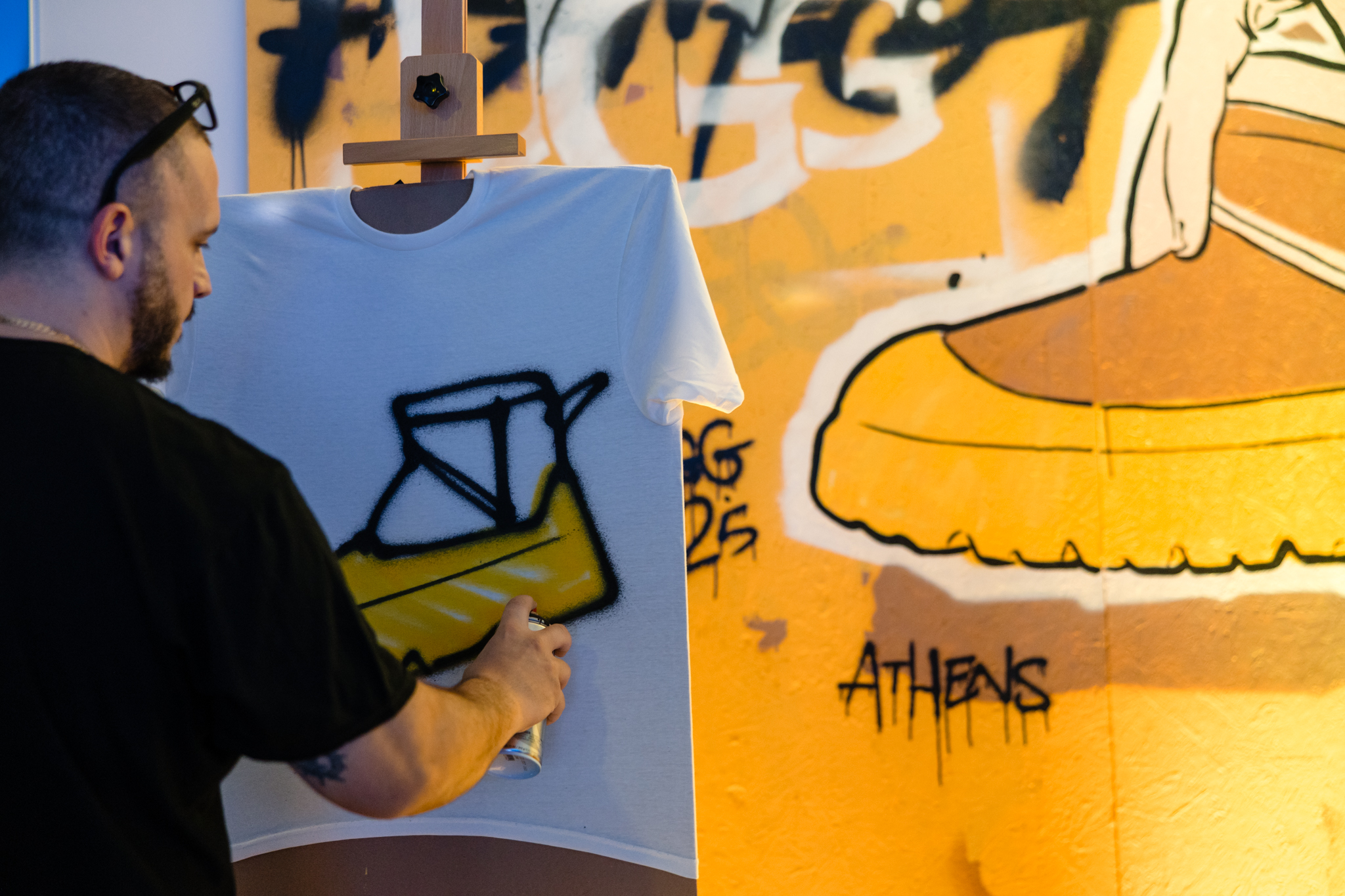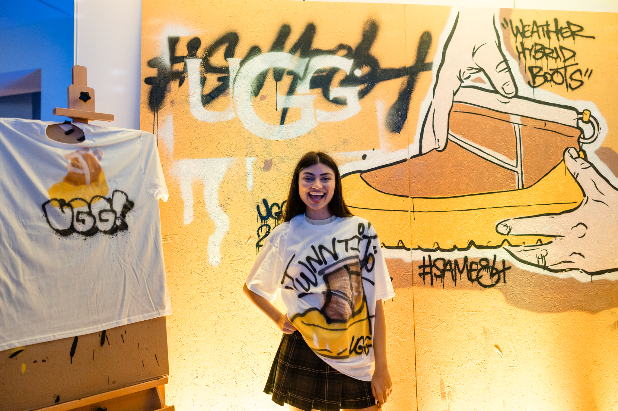 Μία από τις πιο ιδιαίτερες στιγμές της βραδιάς ήταν η παρουσία του Same84, του street artist που είναι γνωστός για τα μεγάλης κλίμακας murals του. Για το event δημιούργησε ένα ειδικά σχεδιασμένο mural με το UGG Weather Hybrid Boot και στη συνέχεια ετοίμαζε live μοναδικά t-shirts με spray για τους καλεσμένους. Κάθε μπλουζάκι είχε μια παραλλαγή του παπουτσιού, ενώ ο καθένας μπορούσε να ζητήσει το όνομά του ή μια μικρή φράση, κάνοντας το κομμάτι εντελώς προσωπικό.