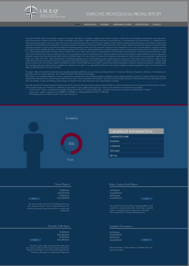 Πρόκειται για μία online πλατφόρμα, την οποία θα ενσωματώνουν οι ναυτιλιακές στην επεξεργασία επιλογής ναυτών, όπου οι ίδιοι οι ναύτες θα κάνουν log in και αναλόγως με την θέση εργασίας τους στο πλοίο θα χορηγούνται και τα αντίστοιχα ψυχολογικά τεστ. Η I. M. E. Q διατηρεί το data base με τα αποτελέσματα των ναυτικών, το αναλύει και το δίνει σε μία πιο απλοποιημένη και κατανοητή μορφή στις ναυτιλιακές.