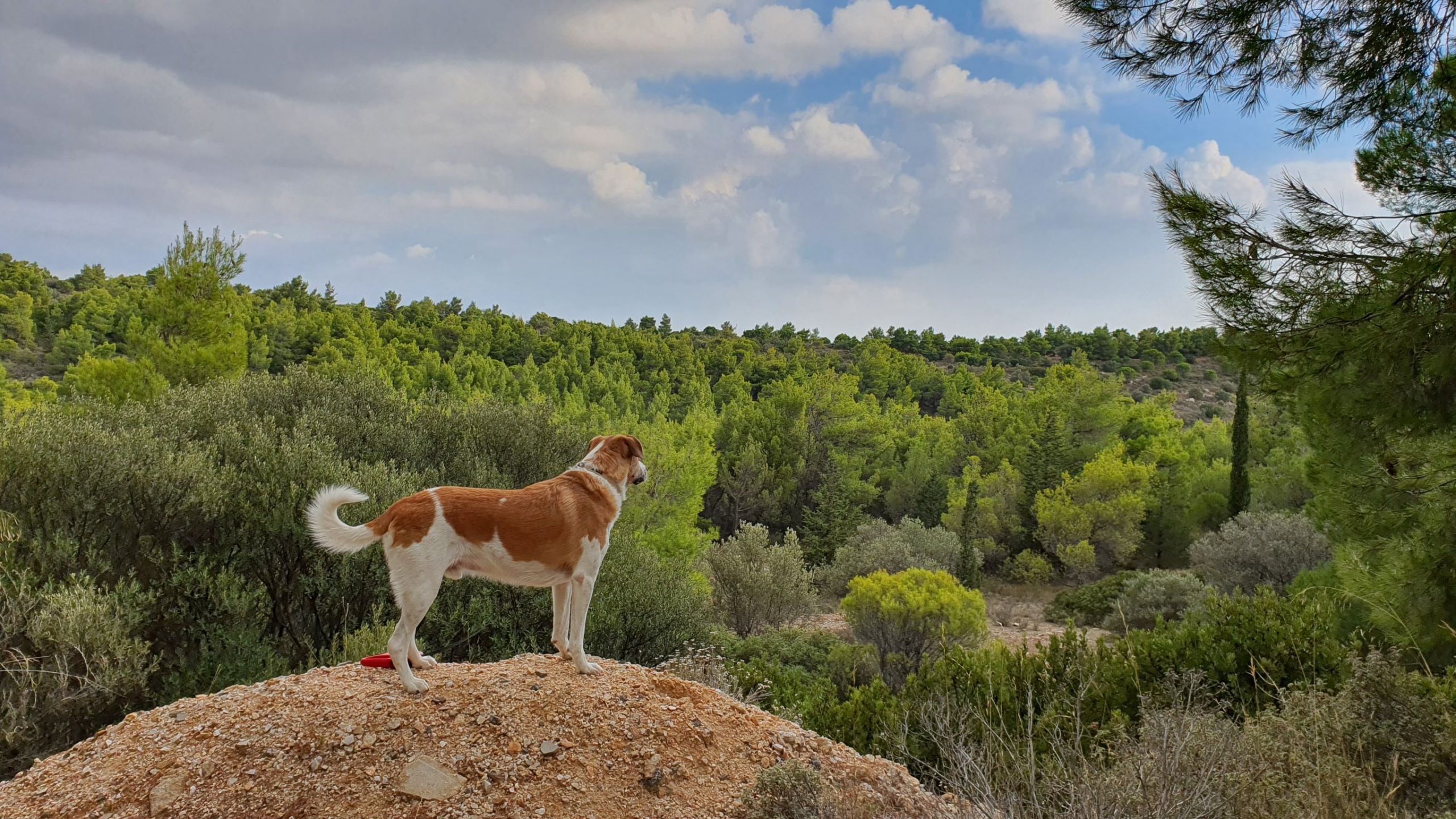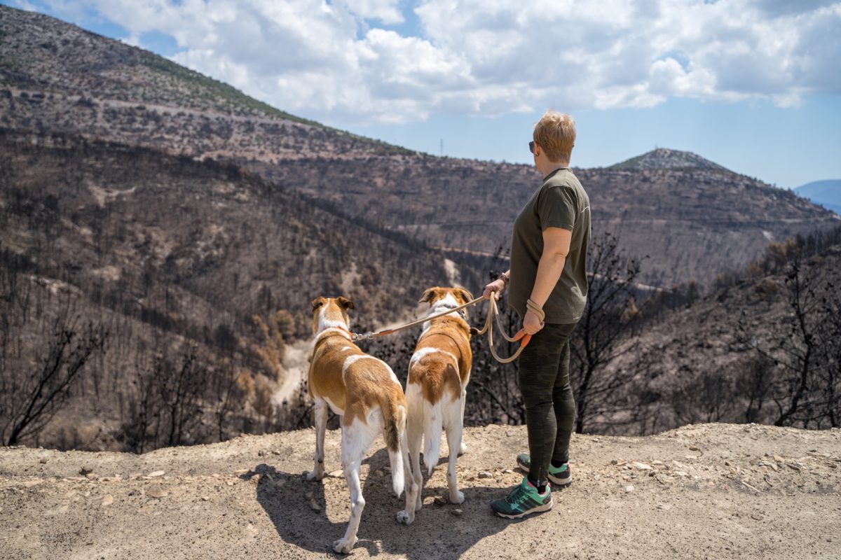 «Μέχρι ένα απόγευμα, που αποφάσισα να τα πάω. Αποφάσισα να υιοθετήσω αυτή την διαδρομή εκ νέου, έστω και με καμένα, αλλά ήταν πολύ δύσκολο. Παντού μυρωδιά καμένου. Βρήκαμε χελώνες που δεν είχαν επιβιώσει και στεναχωρήθηκα πολύ, μέχρι που η Ελπίδα, το ένα από τα σκυλάκια μου, που έχει πολύ ανεπτυγμένο το ένστικτο το κυνηγού, βρήκε μέσα σε μια μικρή πράσινη “τούφα”, σ’ ένα μικρό κομμάτι που είχε γλιτώσει από τη φωτιά, ένα μικρό ζωντανό χελωνάκι. Φυσικά το πήραμε μαζί μας και το φιλοξενώ σε ένα παρτέρι που έχω, μέχρι να το πάω σε ένα ασφαλές πράσινο σημείο».