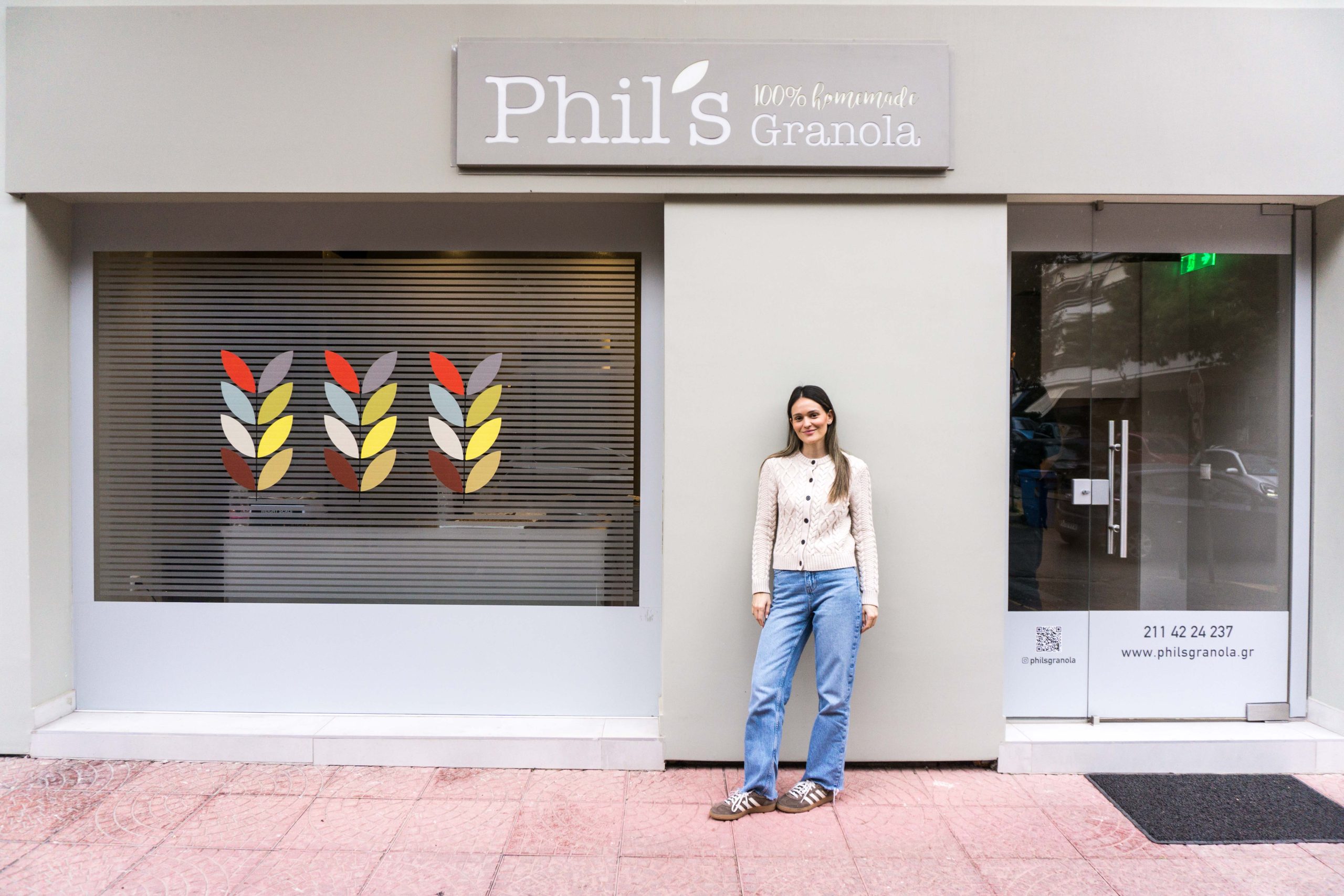 Αυτό το μικρό μαγαζί στεγάζει τη Phil’s Granola, το δημιούργημα της Φιλίππας, η οποία με επιμονή και εργατικότητα εδώ και πέντε χρόνια παράγει μία από τις πιο νόστιμες χειροποίητες γκρανόλες στην Ελλάδα. Η αρχή έγινε το 2020, στην καρδιά της πανδημίας. Η Φιλίππα είχε μόλις επιστρέψει στην Ελλάδα από την Αμερική, όπου ζούσε και εργαζόταν, με σπουδές στη διοίκηση επιχειρήσεων και καριέρα αρχικά στα Ηνωμένα Έθνη κι αργότερα σε εταιρεία καλλυντικών. Ο εγκλεισμός λόγω Covid-19, η διαφορά ώρας με τη Νέα Υόρκη και την εξ αποστάσεως δουλειά και οι ατελείωτες ώρες στο σπίτι, την έστρεψαν σε αυτό που αγαπούσε περισσότερο: να φτιάχνει γκρανόλα!