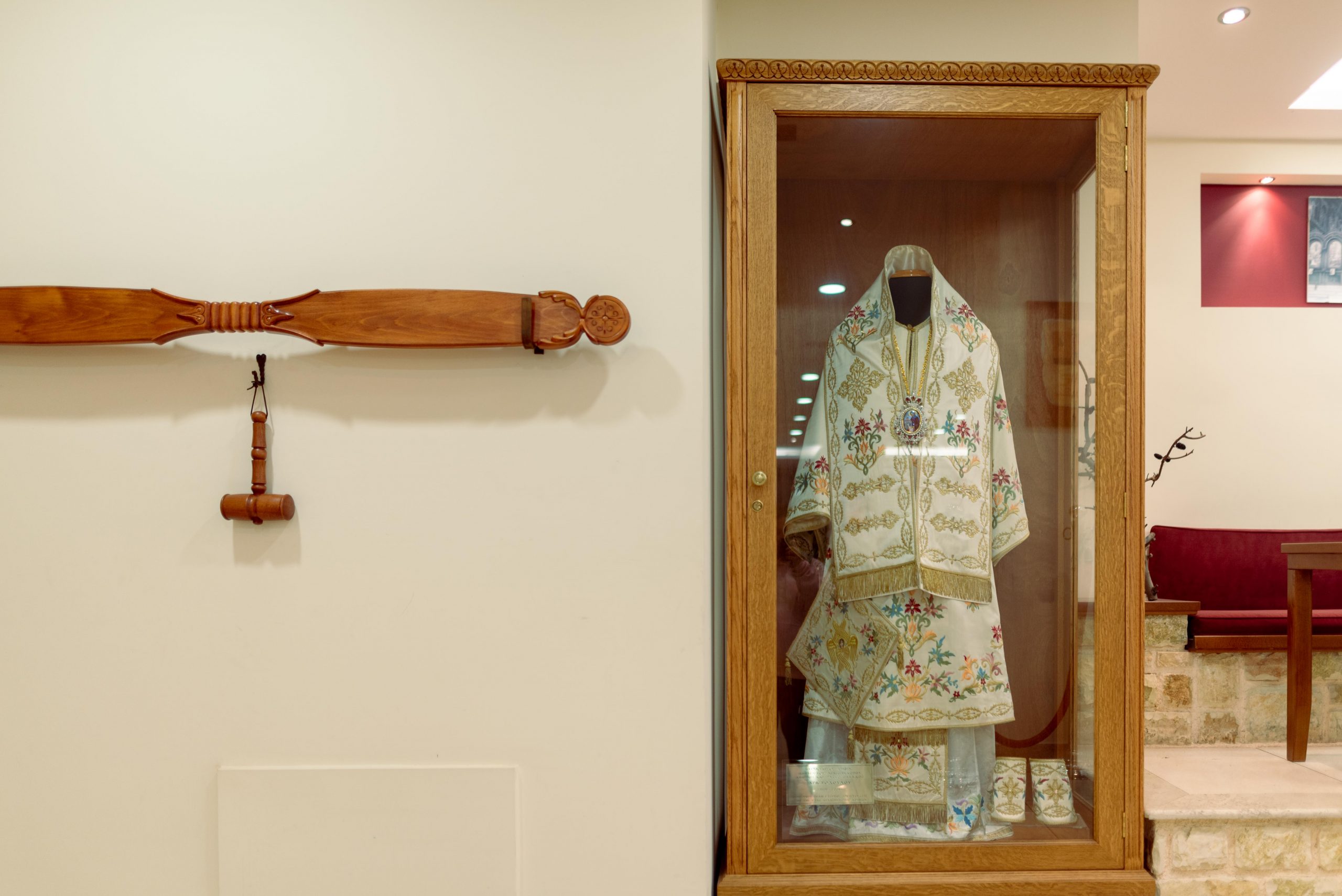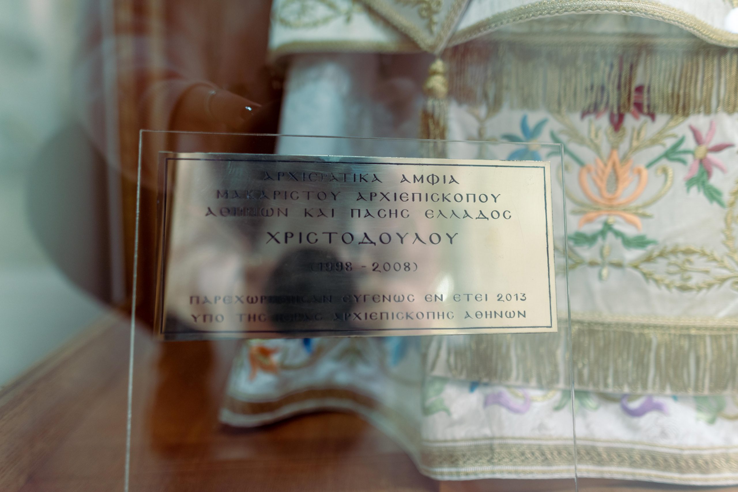 Ο νεωκόρος μαζί με τον πατέρα Ιωσήφ με καθοδήγησαν στην κάτω αίθουσα, η οποία εκτός από περιποιημένη είναι και γεμάτη από εικόνες από την ιστορία της εκκλησίας. Σε μια γωνία ξεχωρίζω μια βιτρίνα με άμφια και ρωτώ τον πατέρα σε ποιον ανήκουν. «Στην εκκλησία μας ξεχωρίζει με μεγάλη διαφορά η παρουσία του Χριστόδουλου. Ο μακαριστός Χριστόδουλος ήταν προϊστάμενος του ιερού ναού περίπου για μια δεκαετία ως Αρχιμανδρίτης, ως ιερωμένος δηλαδή, ταυτοχρόνως ήταν εκείνο το διάστημα γραμματέας στην Ιερά Σύνοδο και εν συνεχεία από εδώ εξελέγη Μητροπολίτης Δημητριάδος στον Βόλο και εν συνεχεία Αρχιεπίσκοπος. Ό,τι έχει περάσει από τα χέρια του Χριστόδουλου, ό,τι επιμελήθηκε, από τα άμφια της Αγίας Τραπέζης, μερικά έπιπλα που εκείνη την εποχή έπρεπε να γίνουν, ό,τι έχει φτιάξει, έχει τη στάμπα του και πολύ ξεχωριστή φυσιογνωμία αισθητικής. Κάποια στιγμή, αν θα αναζητήσει κανείς να καταγράψει μαρτυρίες ανθρώπων οι οποίοι έζησαν τον Χριστόδουλο ως παιδιά και ως έφηβοι, θα μείνει με ανοιχτό στόμα για τη μεγάλη αγάπη που του τρέφουν ακόμα και το πώς έχει αφήσει σφραγίδα στην ψυχή τους. Όλοι έχουν να πουν για τα πολλά προσόντα του στην ομιλία, στη ρητορική, στην ψαλμωδία και σε πάρα πολλά τέτοια ουσιώδη που κάνουν την εκκλησία όχι λαμπρή, την κάνουν προσιτή, δηλαδή σε αγγίζει πρώτα από όλα στα αισθητήριά σου. Οπότε το πέρασμά του από εδώ ήταν καταλυτικό».