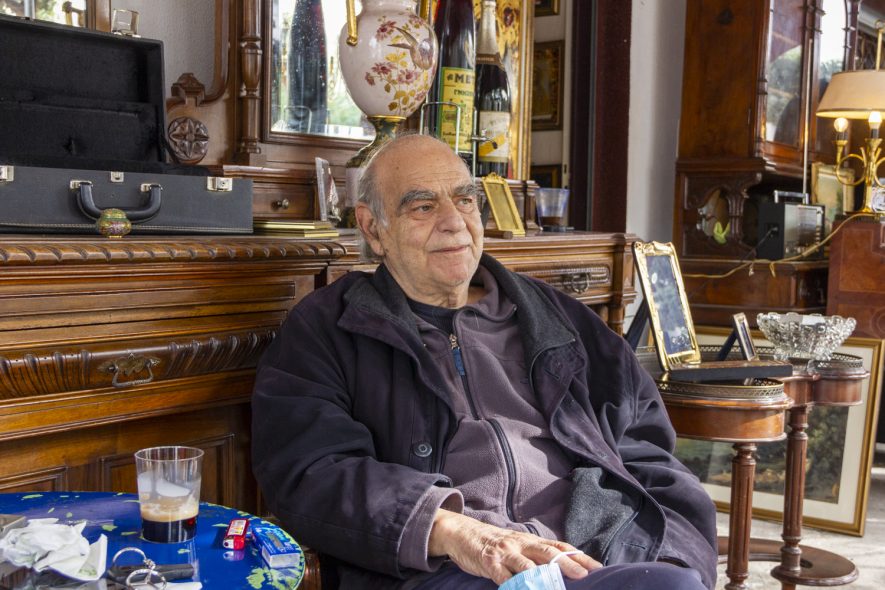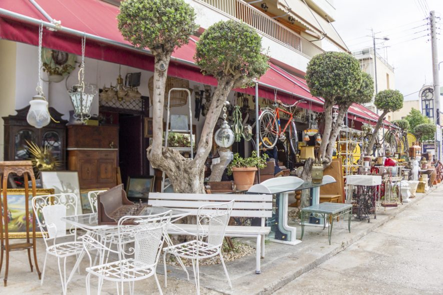 Πρώτη στάση στο γωνιακό παλαιοπωλείο. Μπορεί να μοιάζει σα να βρίσκεται εκεί για δεκαετίες, αλλά η αλήθεια είναι πως άνοιξε πριν από μερικά χρόνια ως υποκατάστημα ενός παλαιοπωλείου με έδρα στο Μοναστηράκι. Αμέτρητα αντικείμενα -στοιβαγμένα με έναν οργανωμένα άναρχο τρόπο, όπως συμβαίνει σε κάθε αντικερί που σέβεται τον εαυτό της- καλύπτουν το πεζοδρόμιο. Ο ιδιοκτήτης δεν τρελαίνεται για συζητήσεις, όμως έξω από το μαγαζί έχουν καθίσει τρεις κύριοι και πίνουν τον καφέ τους κουβεντιάζοντας. Θα περίμενα να δω αυτήν την εικόνα σε κάποιο καφενείο ή στην ταβέρνα λίγο πιο κάτω, αλλά όχι, οι γέροντες της γειτονιάς (με την έννοια του σοφού και όχι του ηλικιωμένου) αράζουν έξω από αυτό το παλαιοπωλείο. Το όνομα και των τριών είναι Κώστας. Δεν γινόταν να τους αγνοήσω.