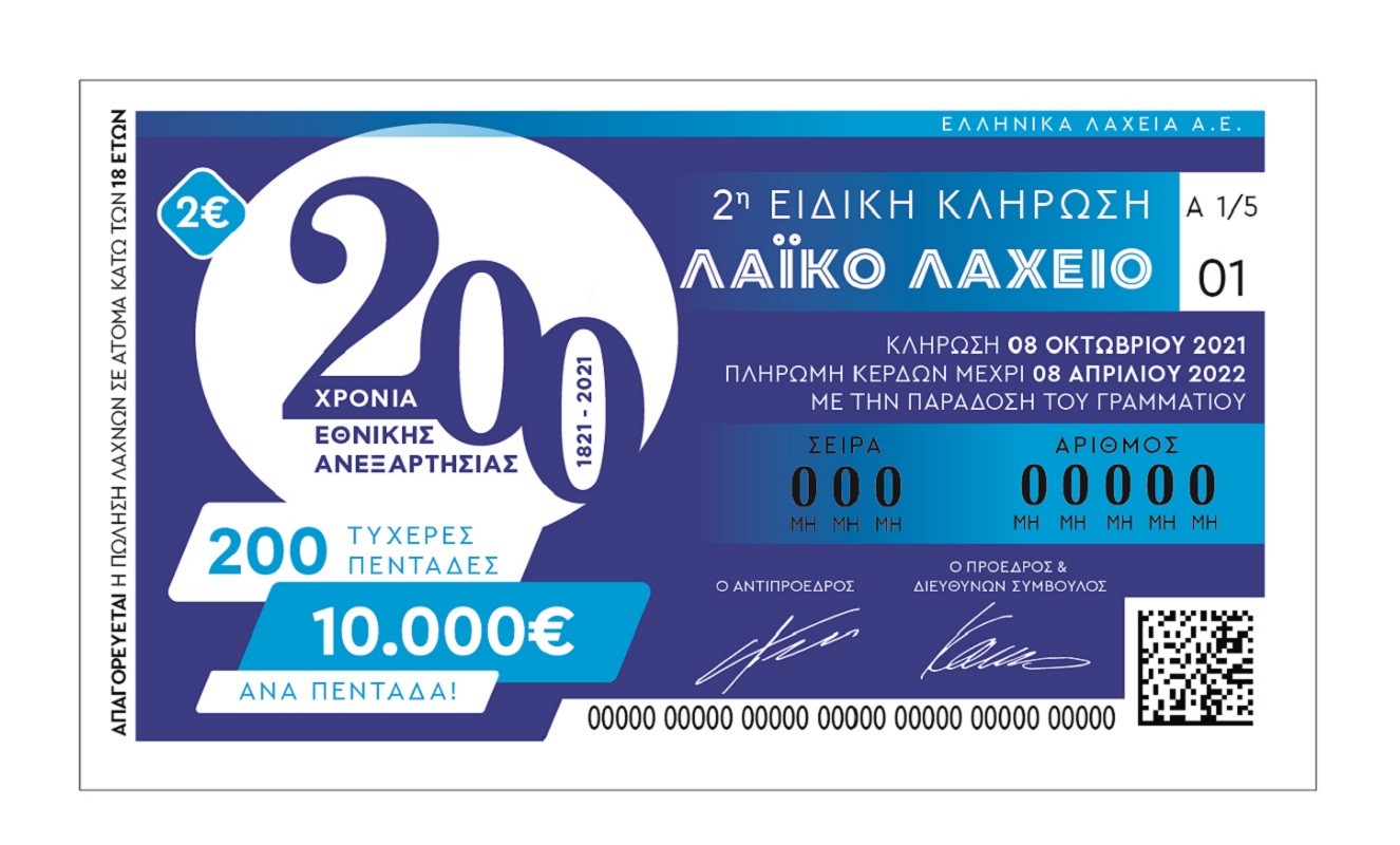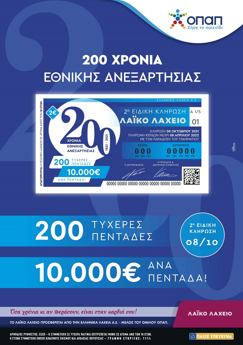 Με αφορμή τη συμπλήρωση των 200 χρόνων από την Ελληνική Επανάσταση, το Λαϊκό Λαχείο θα μοιράσει 10.000 ευρώ σε 200 τυχερούς. Η κλήρωση του παιχνιδιού, θα πραγματοποιηθεί την Παρασκευή 8 Οκτωβρίου, τρεις ημέρες μετά την καθιερωμένη κλήρωση της Τρίτης.