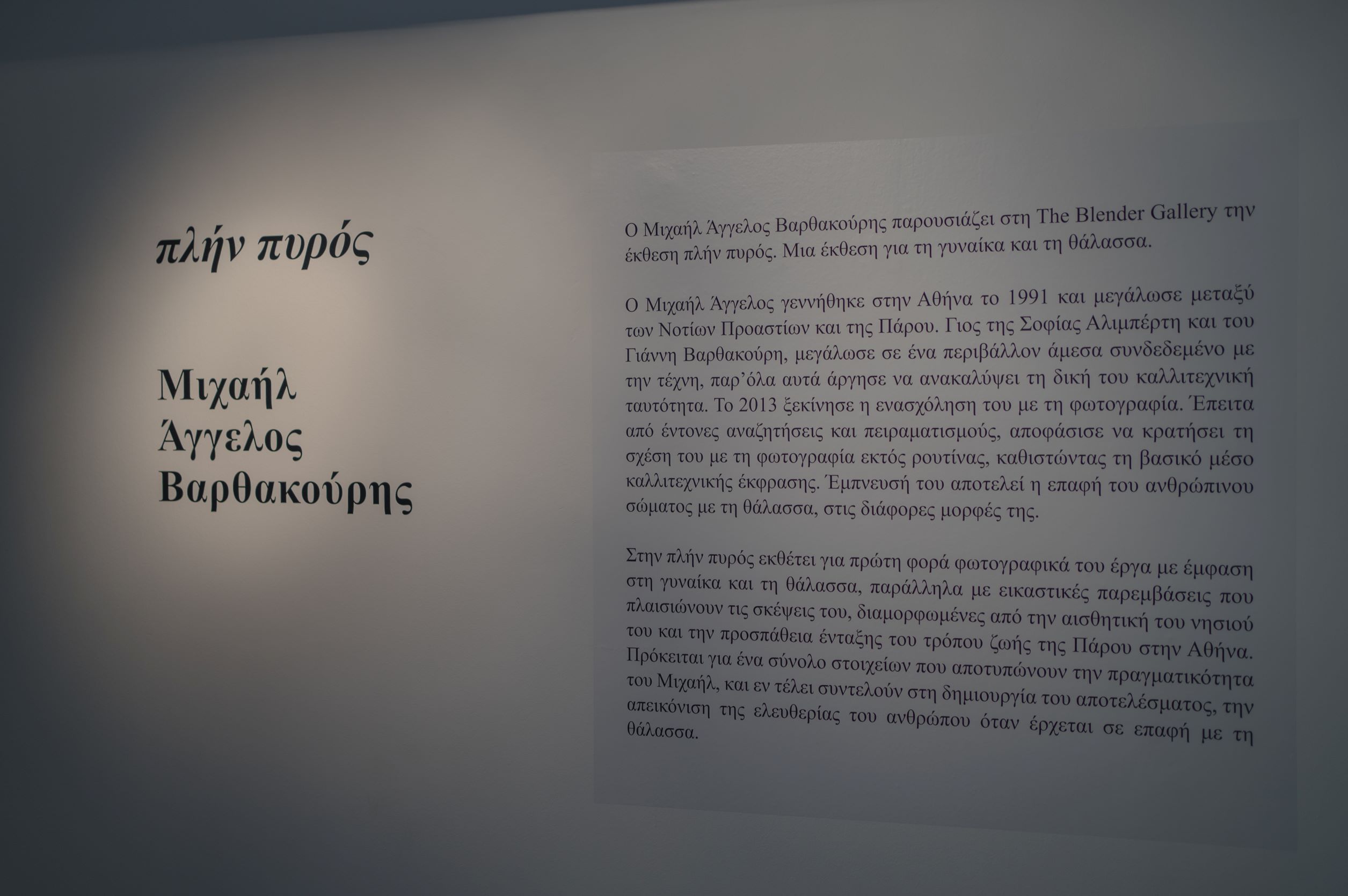 Η έκθεση του Μιχαήλ ονομάζεται «πλην πυρός», όμως ο χώρος της Blender Gallery έχει κατακλυστεί από θάλασσα και ομορφιά. Χορεύτριες του βυθού εναρμονίζονται με τα θαλάσσια ρεύματα με τρόπο μαγικό. Το γυναικείο σώμα φαντάζει ως μέλος της πελαγίσιας ολότητας. Κι όλα απλά και ταπεινά, σαν προσευχή στον πλάστη, με εύστοχους τίτλους παρμένους από το Δοξαστικό του Οδυσσέα Ελύτη, με τη συμβολή και τη βοήθεια της συνεργάτιδάς του, Θέμιδος Σακελαρίου.