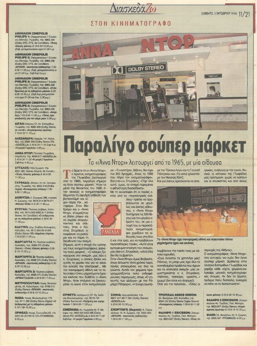 Άννα Ντορ σημαίνει “σινεμά”. Και “παλιά”. Και “κέντρο Γλυφάδας”. Ένα τρανταχτό σημείο αναφορά στον χωροχρόνο. Λες Άννα Ντορ και αναφέρεσαι στη δεκαετία του ’80 και του ’90, όταν αυτός ήταν και ο μοναδικός κινηματογράφος που είχε απομείνει στα Νότια Προάστια. Λες “Άννα Ντορ” και αναφέρεσαι στην πολύβουη Πλατεία Εσπερίδων, στα Queen, στο “Μικρό”, στην Κύπρου, στη Γιαννιτσοπούλου.
