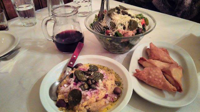 Όταν γύρισε από την κουζίνα, όπου τελικά έσωσε το φρικασέ, μας έφερε να δοκιμάσουμε σουτζουκάκια με ρύζι, κότσι αρνιού με πουρέ, τυροπιτάκια, σαντορινιά σαλάτα και φυσικά φάβα. Την φάβα την σερβίρουν σε μεγάλο πιάτο, της συμπεριφέρονται σαν να είναι κυρίως και όχι ένα απλό ορεκτικό. Έχει δώσει το όνομά της στο μαγαζί άλλωστε. Νοστιμότατη η φάβα τους παιδιά και το λέω εγώ που στις ταβέρνες ποτέ δεν την άγγιζα. Με το κρεμμυδάκι της, με τα όλα της. Όσο για την σαντορινιά σαλάτα μην απορείτε, ο άντρας της κυρίας Ντίνας έχει καταγωγή από την Σαντορίνη, είχε δουλέψει και εκείνη παλιά εκεί. Και την κάππαρη και άλλα υλικά που χρησιμοποιούν στα πιάτα τους τα φέρνουν από την φάρμα που έχουν στο νησί.