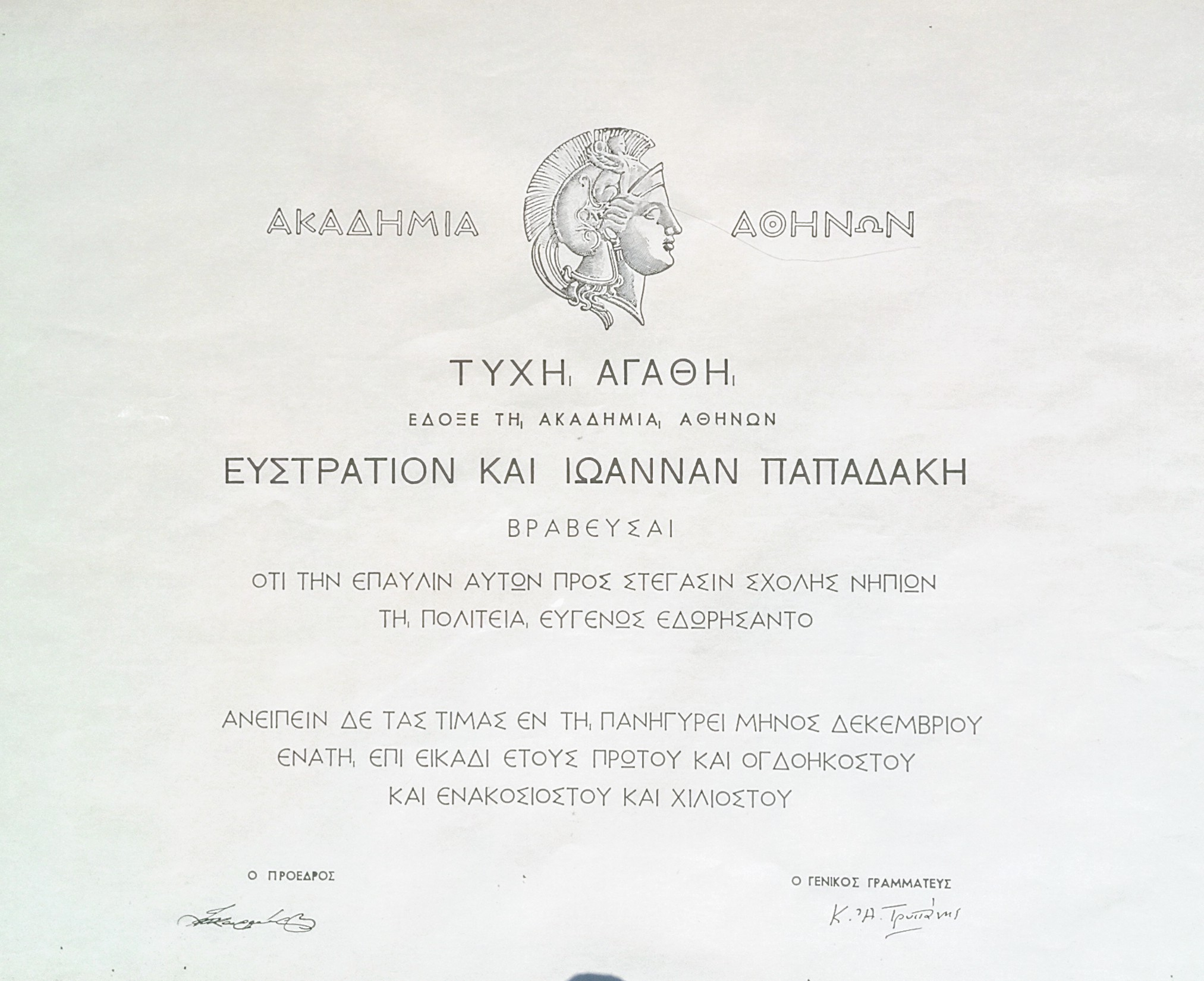 Το ζευγάρι δεν κατάφερε να αποκτήσει παιδιά, όμως το σπίτι τους, όσο ζούσαν εκεί, ήταν πάντα γεμάτο από τα παιδάκια της γειτονιάς, που έπαιζαν στον κατάφυτο κήπο. Ο Στρατής και η Ιωάννα Παπαδάκη θέλησαν, όταν φύγουν και οι δύο από τη ζωή, το σπίτι τους να γίνει νηπιαγωγείο. Έτσι, το κληροδότησαν για αυτόν τον σκοπό στον Δήμο Γλύφάδας.