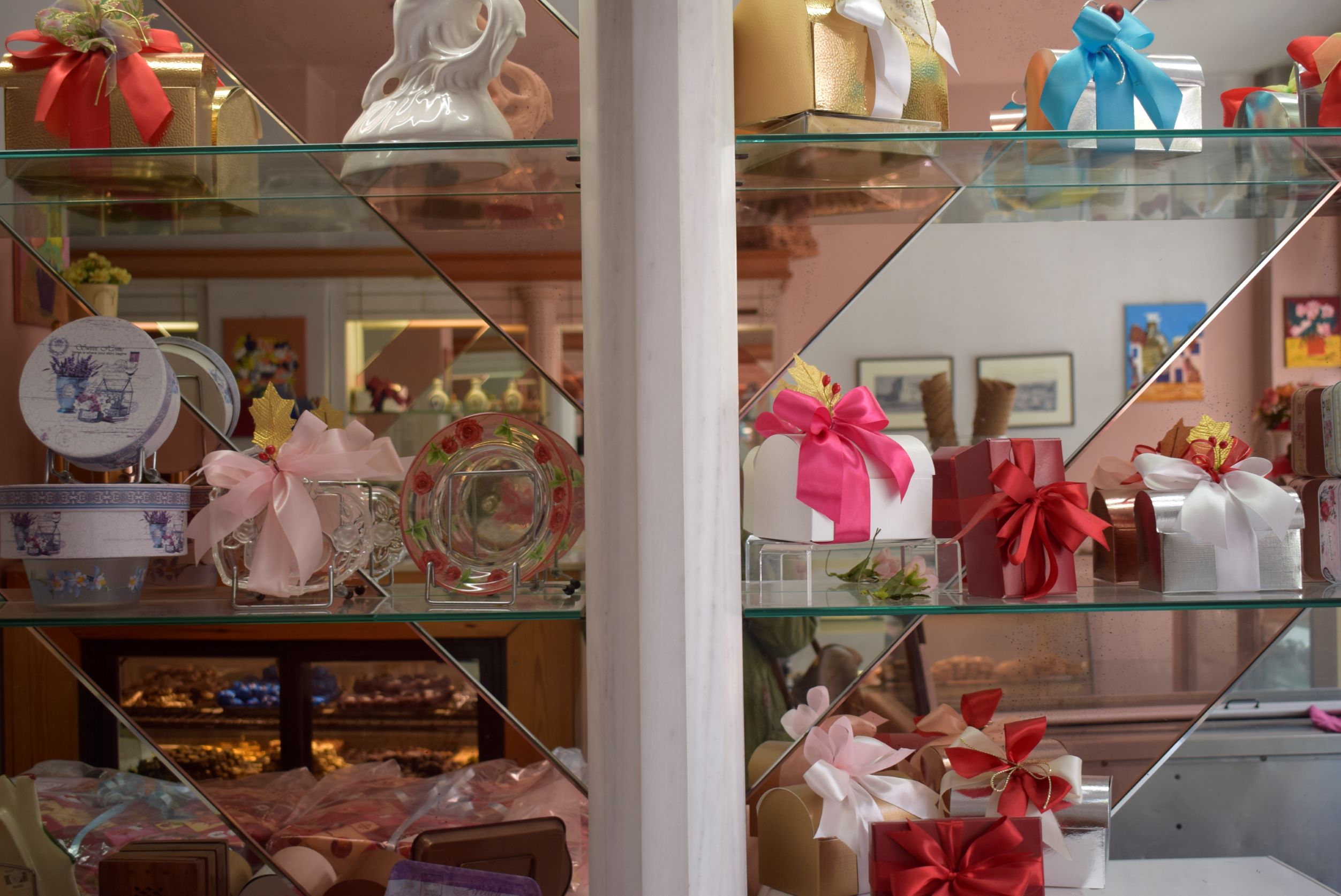 Στα δεξιά του μαγαζιού, βλέπω ράφια με ρετρό διακόσμηση, μπιμπελό σαν αυτά που φύλαγε η γιαγιά μου σαν θησαυρό στο σύνθετο του σαλονιού, συσκευασίες δώρων, κορδέλες, κι άλλες κορδέλες. «Με αυτά ασχολείται εξ ολοκλήρου η γυναίκα μου. Εγώ είμαι της παραγωγής, εκείνη της πώλησης και του “φιόγκου”. Έχει μανία να φτιάχνει και να ξαναφτιάχνει, να ασχολείται με την κάθε λεπτομέρεια. Δεν είναι για εμένα αυτά», μου λέει ο κ. Νίκος.