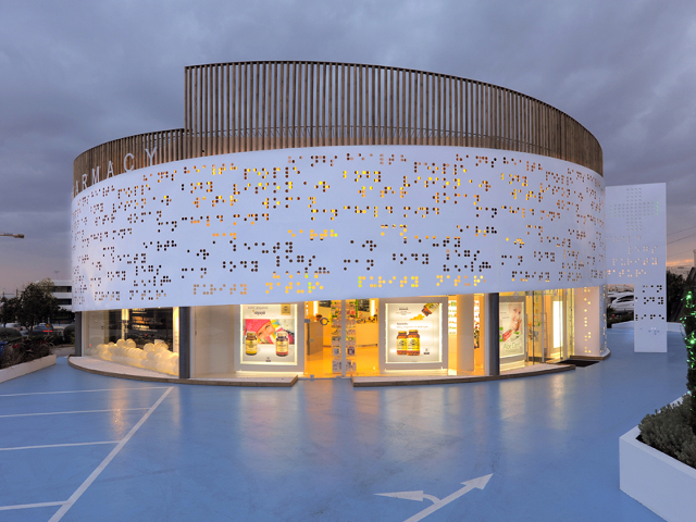 Δεν υπάρχει μία μόνο απάντηση στη συγκεκριμένη ερώτηση. Είχαμε ένα υφιστάμενο κτίριο (ήταν μια εμπορική έκθεση για τα αυτοκίνητα Smart) και έπρεπε να το μετατρέψουμε σε ένα φαρμακείο διαφορετικό από όλα τα άλλα. Συνεπώς θέλαμε να σχεδιάσουμε ένα φαρμακείο που να μη θυμίζει φαρμακείο. Μαζί με τους ιδιοκτήτες επιδιώξαμε να αλλάξουμε την εικόνα του συνοικιακού καταστήματος που έμπαινες μέσα μόνο αν ήσουν άρρωστος. Μας ταίριαζε πιο πολύ η ιδέα ενός χώρου για την πρόληψη και την ευεξία και αυτό προσπαθήσαμε να πετύχουμε. Για να δημιουργήσουμε ακριβώς αυτή την αίσθηση δημιουργήσαμε μια εικόνα ενός clean cut επιστημονικού εργαστηρίου με τη χρησιμοποίηση υλικών ψυχρών όπως inox, πράσινων υαλοστασίων, λευκού γυαλιστερού πατώματος σε συνδιασμό με μια οικολογική πιο φυσική διάσταση τονίζοντας την με τη χρησιμοποίηση ξύλου και θάμνων bamboo. Για την έκθεση των προϊόντων επιλέχθηκε η σχεδόν μουσειακή προσέγγιση από την τυπική εμπορική που συνωστίζει παραθέτοντας απλά τα προϊόντα.