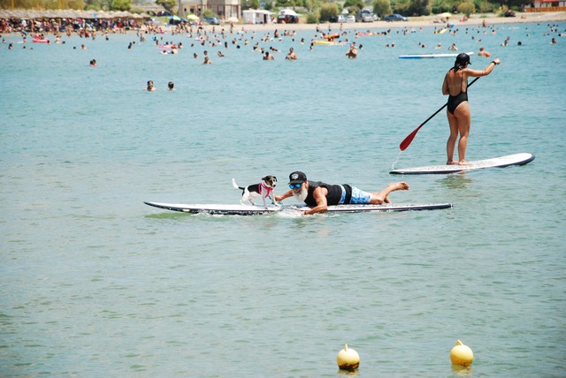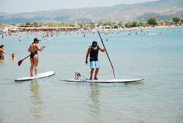 Εκείνη την στιγμή ακούστηκε ένα γαβγισμά. Ήταν ο Λάμπρος, ο σκύλος του Κώστα και μόνιμος σύντροφος του. Έχουν ακριβώς την ίδια τρέλα και λαχτάρα για το νερό. Άρπαξε μια σανίδα SUP ένα κουπί και τον πήρε και μπήκαν θάλασσα. Ο Λάμπρος αγέρωχος πάνω στην σανίδα παρακολουθούσε την βαρκάδα και περίμενε την κατάλληλη στιγμή για να βουτήξει. Ήταν πραγματικά απίστευτο πόσο μοιάζει ο Κώστας με τον Λάμπρο και πως ταιριάζουν πάνω στην σανίδα. Και οι δύο ευτυχισμένοι που βρίσκονται τόσο κοντά στο στοιχείο που λατρεύουν. Ο Κώστας όσο ήταν μέσα γελούσε σαν μικρό παιδί και εκέι κατάλαβα όλα όσα μου είχε πει για την σχέση του με το νερό.