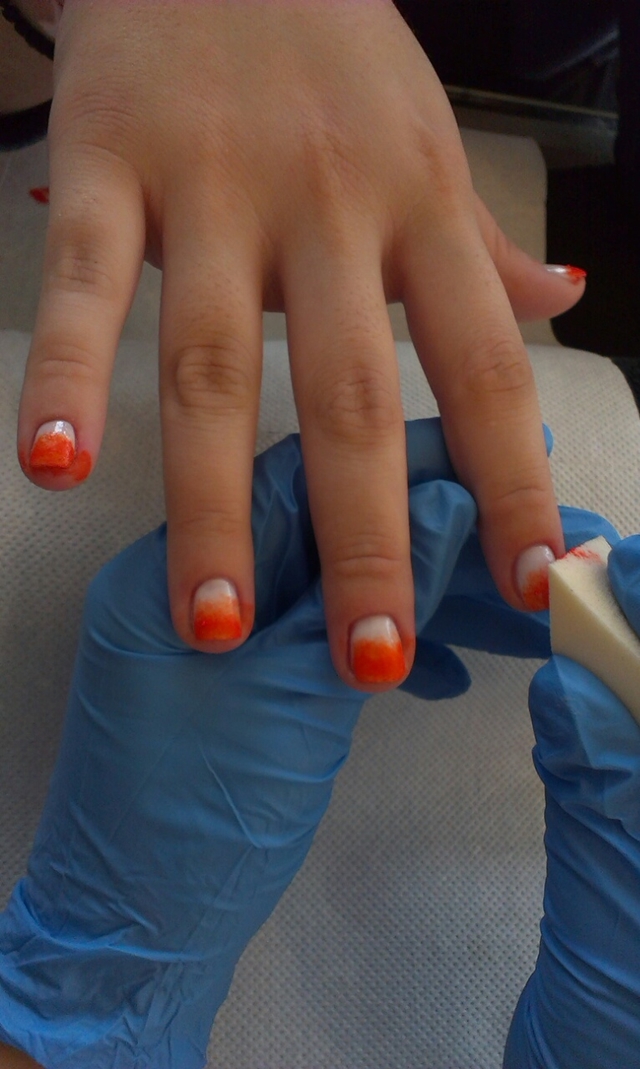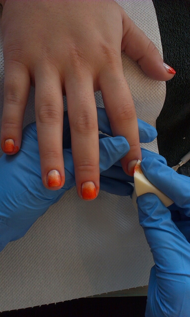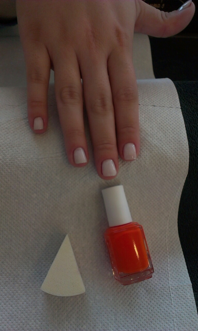 2. Παίρνουμε ένα σφουγγαράκι και ένα πορτοκαλί βερνίκι.