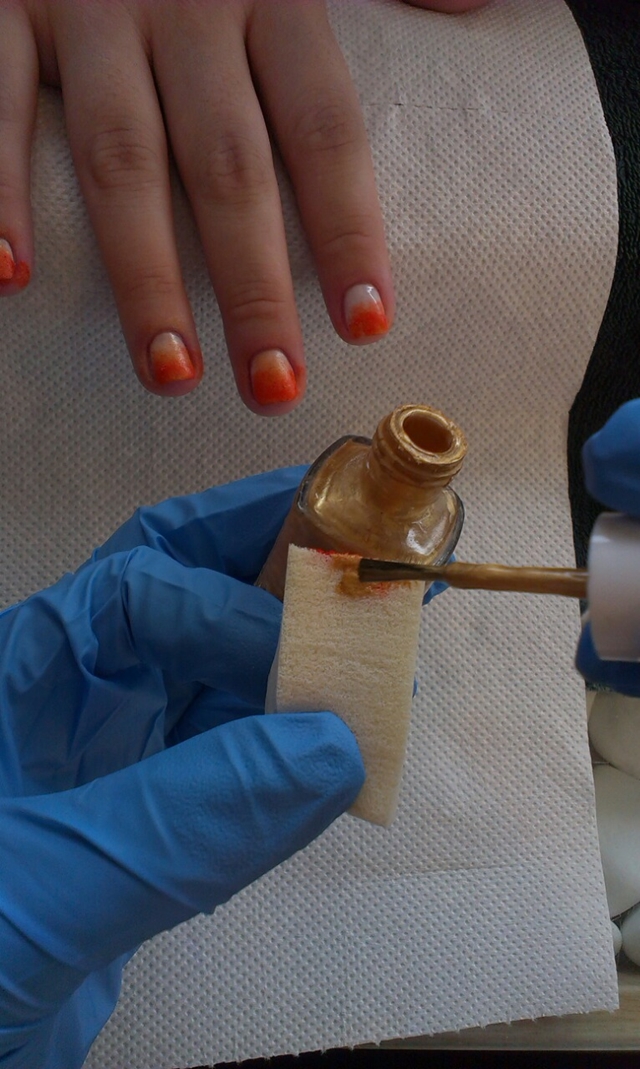 5. Έπειτα παίρνουμε ένα χρυσό βερνίκι και το τοποθετούμε πάνω στο σφουγγαράκι μας.