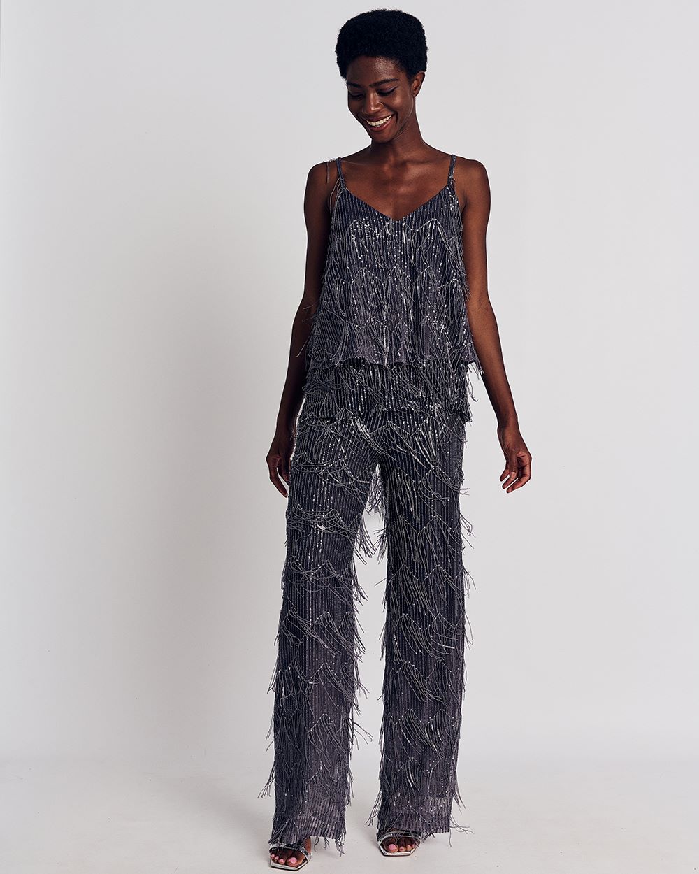 Εκτός όμως από τα φορέματα που κάνουν το brand να αποπνέει μια twisted classic κομψότητα, με τα σατέν printed, τα μίντι κλος σαντούκ ή τα μίνι dresses με παγιέτα, στη λίστα των must haves προσθέσαμε το pale γκρι παντελόνι με κρόσια και παγιέτες που συνδυάζεται με ίδιο τοπ και δίνει το password για ξέφρενες βραδιές.