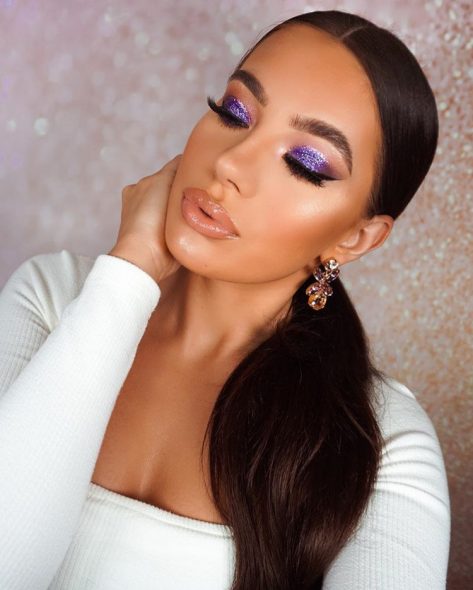 Φέτος τα μωβ χρώματα σκιών πρωταγωνίστησαν σε πολλές παλέτες και το είδαμε σε πολλά beauty looks στο Instagram. Για το ρεβεγιόν της Πρωτοχρονιάς μπορούμε να εμπνευστούμε από αυτό το λαμπερό look και να το τολμήσουμε γιατί είναι πολύ πιο εύκολο απ’ ότι φαίνεται. Τοποθετούμε μωβ σκιά στο κινητό βλέφαρο και κάνουμε πολύ καλό blend. Μετά, βάζουμε με ένα πινελάκι ή ακόμα και με το δάχτυλο μας ένα pigment σε μωβ/ασημί απόχρωση, πάνω από την μωβ σκιά. Για όσες δεν γνωρίζουν, τα pigments είναι σκιές με έντονη λάμψη σε μορφή πούδρας και είναι ιδανικά για εντυπωσιακά look. Για τα χείλη μπορούμε να χρησιμοποιήσουμε το αγαπημένο μας nude κραγιόν και να δώσουμε λάμψη με ένα lip gloss. Δεν θα μπορούσαμε φυσικά να παραλείψουμε τις γυαλάδες κόκκαλα, ψηλά στα ζυγωματικά.