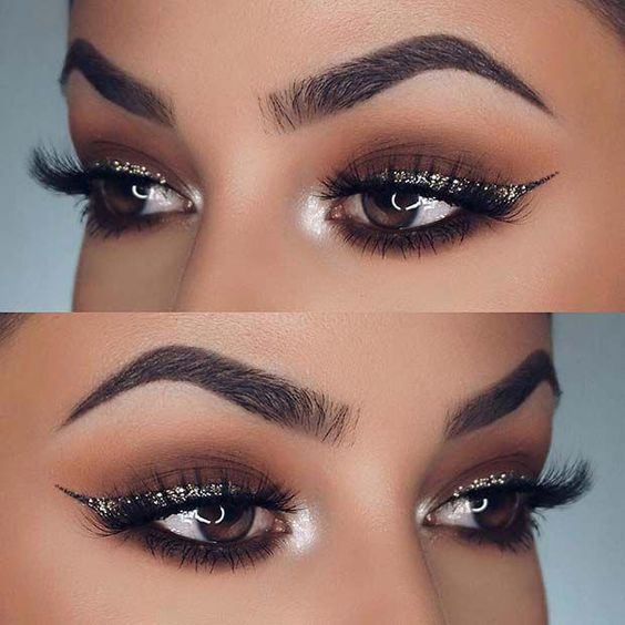 Ένα ιδανικό look για την περίσταση είναι glitter eyeliner look. Είναι ένα ιδιαίτερο και και εντυπωσιακό μακιγιάζ που σίγουρα θα μας κάνει να ξεχωρίσουμε. Ξεκινάμε δίνοντας βάθος στα μάτια με μια απαλή καφέ σκιά, όχι πολύ σκούρα. Στη συνέχεια κάνουμε την κλασσική γραμμή eyeliner αλλά αντί να χρησιμοποιήσουμε μαύρο χρώμα, παίρνουμε ένα eyeliner με glitter το οποίο μπορούμε να βρούμε εύκολα στο εμπόριο σε όλα τα μαγαζιά με καλλυντικά. Βάζουμε έντονη λάμψη στην εσωτερική γωνία του ματιού για να δώσουμε φως, και περνάμε με ένα καφέ ή μαύρο μολύβι την εσωτερική γραμμή του ματιού αλλά και από κάτω. Αν θέλουμε να τονίσουμε ακόμα περισσότερο το βλέμμα μπορούμε να βάλουμε ψεύτικες βλεφαρίδες και να απογειώσουμε το look.