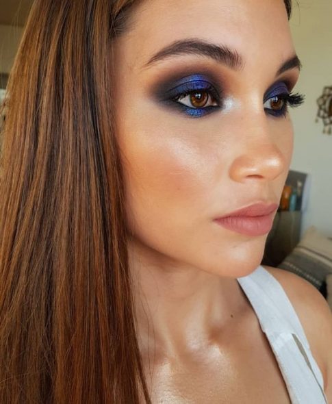 Τέλος, μπορούμε να δημιουργήσουμε ένα λαμπερό smokey look χρησιμοποιώντας μεταλλική μπλέ σκιά. Ξεκινάμε με μαύρη σκιά, απλώνοντας την σε όλο το βλέφαρο αλλά και κάτω απ’το μάτι. Επειδή η σκιά είναι πολύ σκούρα πρέπει να δώσουμε μεγάλη προσοχή στο blending για να μην αφήσουμε σκληρές γραμμές. Στο κέντρο του κινητού βλέφαρου τοποθετούμε την μπλέ σκιά και κάτω απ’το μάτι. Κάνουμε ξανά καλό blending για να ‘δέσουμε’ την μπλέ σκιά με την μαύρη. Βάζουμε λάμψη στην εσωτερική γωνία του ματιού και στα χείλη ένα nude κραγιόν μιας και όλη η ένταση είναι στα μάτια.