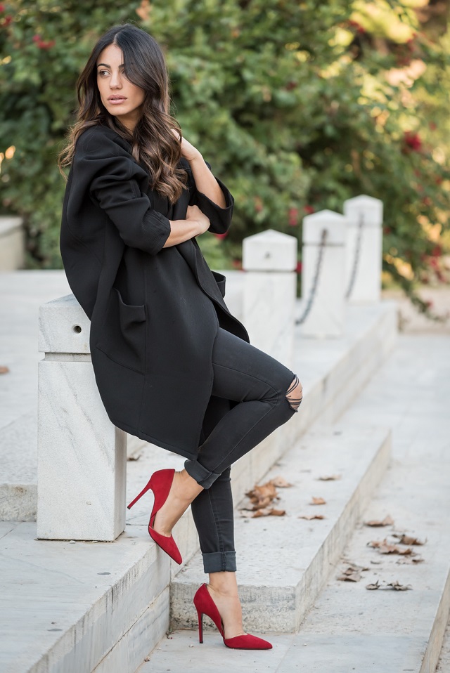 Ήδη αρχίσαμε να γιορτάζουμε τα Χριστούγεννα, και τι πιο κλασικό από ένα κόκκινο παπούτσι. Ένα ζευγάρι κόκκινες γόβες μπορεί να αναδείξει ένα ολόκληρο ντύσιμο και ας φοράς ένα απλό μαύρο παλτό και ένα γκρί σκούρο σκισμένο jeans, όπως ακριβώς η Μιρκέτα στο παραπάνω outfit. Το γιορτινό κόκκινο καστόρι τους και το μαλακό δέρμα στο εσωτερικό τους, κάνει την εφαρμογή τους μοναδική. Μπορείς να τις φορέσεις σε ρεβεγιόν μα και σε μια βόλτα που θα πας ένα απόγευμα. Για μένα, αυτό το ντύσιμο είναι η επιτομή του all day look για να σε κάνει να θέλεις να κανονίσεις να πας και για ποτό μετά την δουλειά.