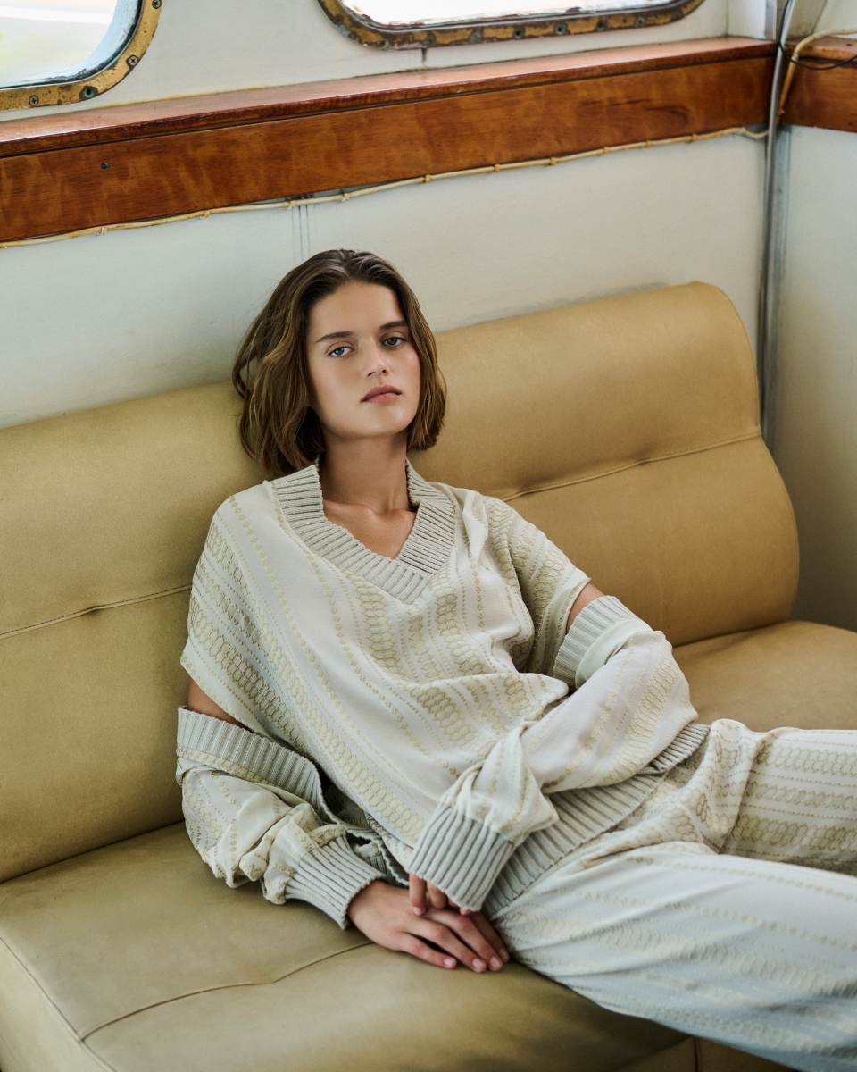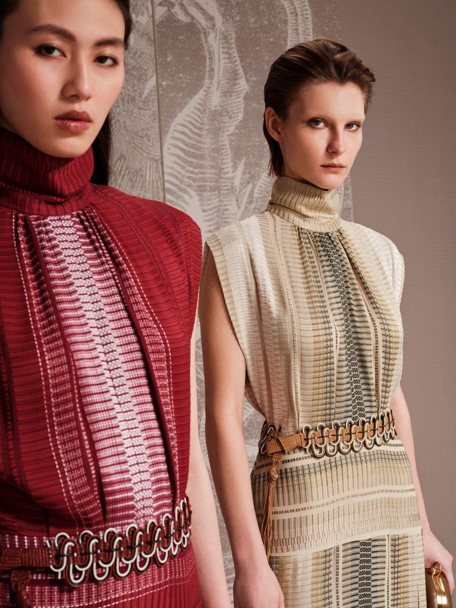 Η παλέτα της συλλογής είναι ζεστή και γήινη, με αποχρώσεις χακί, βαθύ μπορντό, γκρι-μπλε και κρεμ. Το σπαθωτό μετάξι υφαίνεται σε ιβουάρ με χρυσή κλωστή, ενώ τα ντεγκραντέ Tempo αναδεικνύουν απαλές διαβαθμίσεις χρωμάτων – από το σκούρο στο ανοιχτό χακί, το γκρι-μπλε και το μπορντό. Το δέρμα επανασυστήνεται φέροντας τυπωμένα μοτίβα που θυμίζουν φίδι, πόνυ, ζέβρα και λεοπάρ. Μετάξι, μαλλί, βελούδινο κοτλέ και μάλλινο-λινό με υφή που θυμίζει denim συνδυάζονται με shearling πανωφόρια, προσφέροντας άνεση και ζεστασιά. Όλα τα υφάσματα είναι βαμμένα με οικολογικές βαφές που μειώνουν την κατανάλωση νερού, ενώ προέρχονται αποκλειστικά από πιστοποιημένους παραγωγούς που σέβονται το περιβάλλον. Ακόμη και οι λεπτομέρειες αντανακλούν αυτήν τη φιλοσοφία: τα κουμπιά είναι φτιαγμένα από φυσικά ή ανακυκλωμένα υλικά.