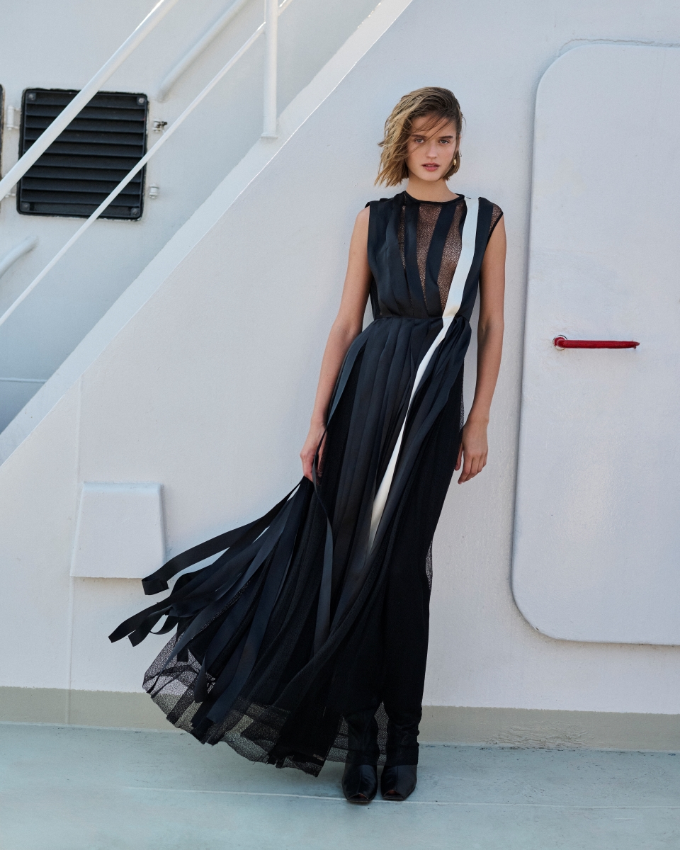 Ο creative director Marios Schwab φέρνει στο σήμερα τη Χίμαιρα του Arezzo, αποτυπώνοντας τη φαντασιακή μορφή της σε μετάξι με μια σχεδόν-ξεχασμένη τεχνική χαρακτικής. Μια από τις πιο παραδοσιακές μορφές τέχνης, που απαιτεί αφοσίωση και σχολαστική διαδικασία: το σχέδιο γεννιέται στο χαρτί, χαράσσεται στο ξύλο, γίνεται σφραγίδα και, τελικά, ζωντανεύει πάνω σε ένα signature μαντήλι. Το μαντήλι αυτό, μέρος μιας εκτεταμένης σειράς μεταξωτών σχεδίων, γίνεται εμβληματικό κομμάτι της συλλογής. Δέρμα με ανάγλυφες λεπτομέρειες, σμιλεμένα μεταλλικά στοιχεία και περίτεχνα κεντήματα αναδεικνύουν τη συμβίωση ανθρώπινων και ζωικών μορφών, ενώ για πρώτη φορά εμφανίζεται το λεοπάρ print, ισορροπώντας ανάμεσα στο statement και το διαχρονικό. Η αύρα του Art Nouveau διαπερνά τη συλλογή. Κρόσσια και φούντες στα μανίκια και τα στριφώματα δημιουργούν κίνηση. Δαντέλα και κορδέλες παίζουν με τη διαφάνεια, κρύβοντας και αποκαλύπτοντας τη σιλουέτα. Πλισέ υφές προσθέτουν βάθος και ροή, ενώ μάλλινα παλτό με τονισμένους ώμους και γιακάδες, και παντελόνια με πιέτες φέρνουν στο νου τη ναυτική αισθητική των δεκαετιών ’20–’30 όπως αποτυπώνεται στα μυθιστορήματα του Καραγάτση.