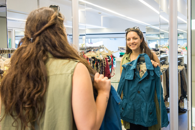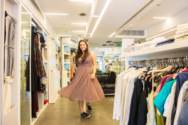 Πρώτη στάση ο πρώτος όροφος, εκεί που βρίσκονται τα γυναικεία, πάντα με στόχο να βρω το καλύτερο φόρεμα για τα καλοκαιρινά parties που έρχονται στα νότια προάστια. Άρχιζα να δοκιμάζω ‘μανιασμένα’ ότι μου έκανε κλικ. Δηλαδή σχεδόν τα πάντα. Η υπεύθυνη στο γυναικείο τμήμα, εξίσου σικάτη και χαμογελαστή, προσπάθησε φιλότιμα να με βοηθήσει.