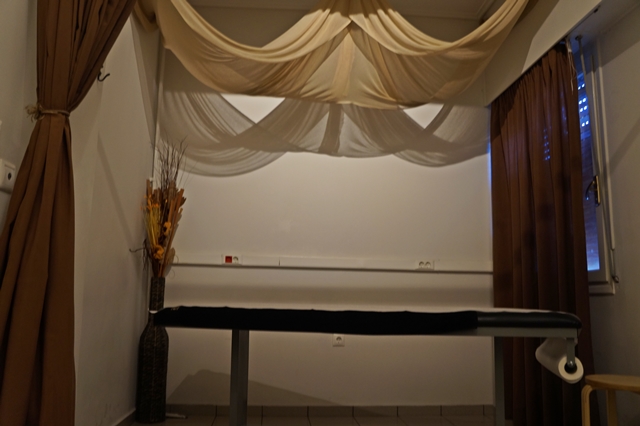 Στο City Massage η φιλοσοφία στη διακόσμηση ήταν εξίσου λιτή κι απέριττη. Με οδήγησαν σ΄ ένα δωμάτιο με ψεύτικους ήλιους λουλούδια στον τοίχο, αν και τελικά προτιμούσα το δωμάτιο με τα πανιά στο ταβάνι, που φωτογράφισα. Στο concept αυτό, όλα τα λεφτά ήταν η μασέζ μου η Αργυρώ. Με ρώτησε αν θέλω χαλαρό ή αθλητικό μασάζ και είπα, το ρεπορτάζ τελειώνει να το ρίξω λίγο στα βαριά (Δώσε και σώσε Αργυρώ!), οπότε πήρα το αθλητικό. Στη συνέχεια αναρωτιόμουν πως μπορεί μια σταλιά γυναίκα να έχει τόση δύναμη στα χέρια της. Γενικά η Αργυρώ φαινόταν πως ξέρει τι κάνει. Μου έκανε επίσης 2 πιέσεις στα σημεία κουμπιά, όπως μου τα είπε, στην ωμοπλάτη και με ρώτησε αν μούδιασαν κάπως τα χέρια μου. Όπως μου εξήγησε πιανόμαστε γιατί δεν αιματώνονται σωστά τα σημεία και με την κατάλληλη πίεση κυκλοφορεί καλύτερα το αίμα. Στο City Massage μπορείς να κάνεις 20λεπτο μασάζ με 6€ και υπάρχει και η δυνατότητα για μασάζ στο χώρο σου.