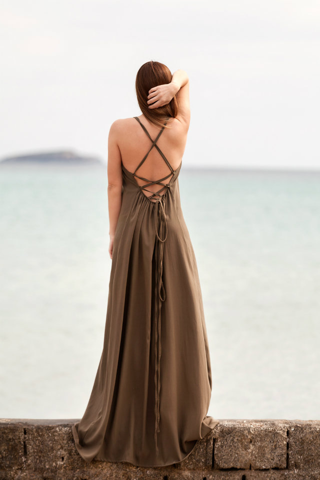 Ένα φόρεμα που ποτέ δε θα σε περιορίσει στυλιστικά, καθώς είναι σαν ένας “καμβάς” σε γήινο χρώμα που σου επιτρέπει να “παίξεις” με τα αξεσουάρ που θες. Μας αρέσει ο αέρινος, λιτός χαρακτήρας του γιατί εκφράζει ανεμελιά και θηλυκότητα. Διαθέτει επίσης εντυπωσιακή πλάτη, ενώ διατίθεται και σε λευκό. Συνδύασέ το με λεπτά χρυσά κοσμήματα.