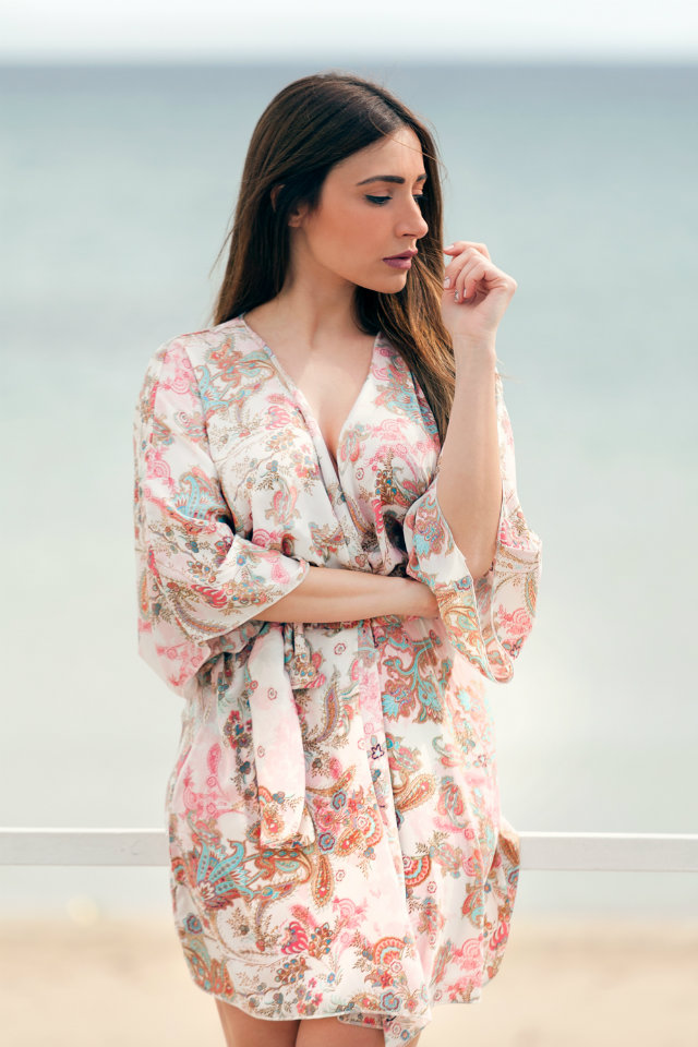 Ακόμη ένα κιμονό που δένει μπροστά, σε εκρού χρώμα με μακριά κρόσια στα μανίκια. Μπορείς να το φορέσεις πάνω από το μαγιό σου στην παραλία, αλλά και στη βόλτα σου στο νησί είτε ανοιχτό με ένα τζιν σορτσάκι, είτε τελείως κλειστό σαν φόρεμα, συνδυάζοντάς το με ιδιαίτερα αξεσουάρ, όπως μια καφέ τσάντα-πουγκί με κρόσια, ξύλινα bangles στο χέρι και χρυσά σανδάλια σε αρχαιοελληνικό στυλ.