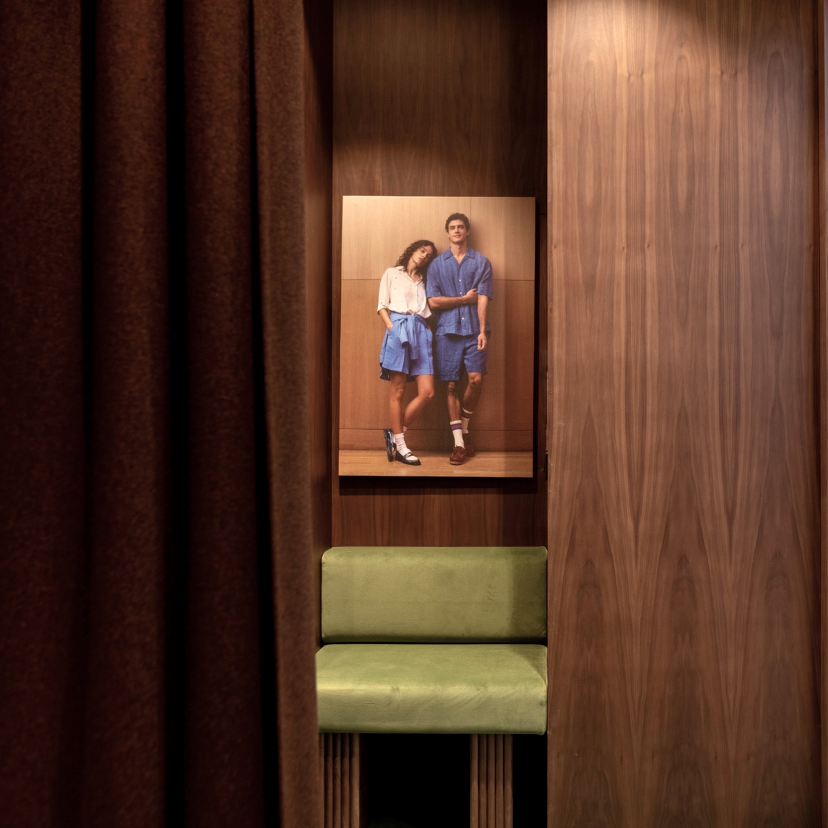 Ο χώρος του καταστήματος χαρακτηρίζεται από ζεστά και πλούσια υλικά, τα οποία δημιουργούν μία φιλόξενη και πολυτελή ατμόσφαιρα. Ο σχεδιασμός του χώρου περιλαμβάνει φυσικά, εκλεπτυσμένα υλικά όπως ξύλο καρυδιάς, δρύινα στοιχεία, τραβερτίνη, βελούδο και μπρούτζο. Η συνολική εμπειρία ενισχύεται από φωτιστικά τύπου βιβλιοθήκης, προσδίδοντας εκλεπτυσμένη αίσθηση, δημιουργώντας ένα ζεστό και κομψό περιβάλλον που γεφυρώνει παρελθόν και παρόν με στοιχεία που συνδυάζουν τον ρετρό χαρακτήρα των 50s με σύγχρονη αισθητική.