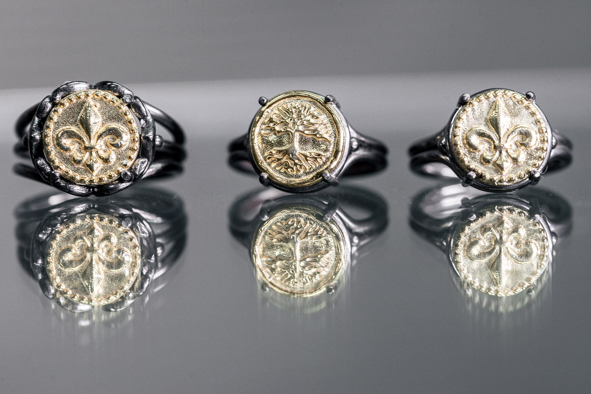 Δεν υπάρχει όριο στη φαντασία αλλά και στις δυνατότητες του σχεδιασμού. «Σε ένα δαχτυλίδι δέσαμε με ασήμι το βότσαλο από μια παραλία, όπου χαράξαμε και τις συντεταγμένες όπου συναντήθηκε το ζευγάρι ή σε ένα άλλο σχεδιάσαμε το εσωτερικό του φωτογραφικού φακού» λένε ο Κωνσταντίνος και η Ευγενία. Φυσικά, σε αυτή την κατηγορία πρωταγωνιστούν τα δαχτυλίδια αρραβώνα, που ξεφεύγουν από τα κλασικά μονόπετρα -πραγματικά ξεχωριστό το κόσμημα από λευκό χρυσό με μαύρη επιροδίωση και μαύρο διαμάντι-, αλλά και οι βέρες που αποκτούν έναν συμβολισμό εντελώς προσωπικό, αφού είναι σχεδιασμένες για κάθε ζευγάρι ξεχωριστά. Οι βαφτιστικοί σταυροί είναι εξίσου δημιουργικοί, όπως και τα κοσμήματα για νέες μαμάδες (newborn συλλογή) που παίρνουν μια εντελώς διαφορετική εικόνα από εκείνη που έχουμε συνηθίσει.